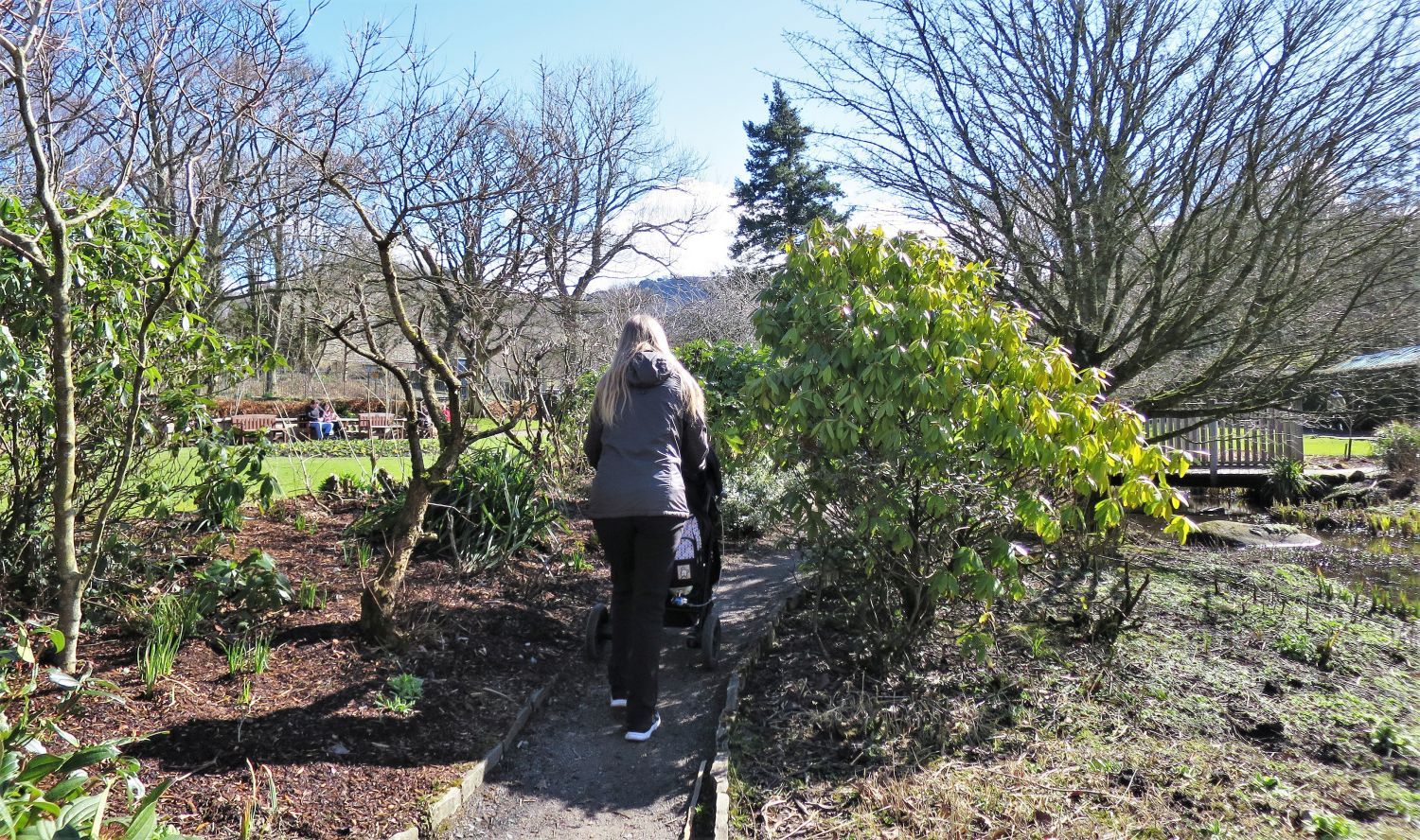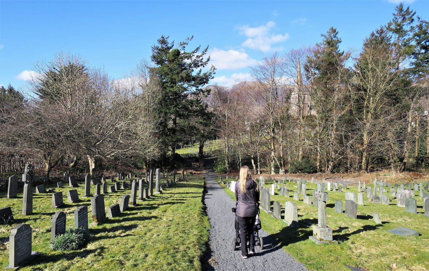 From the road, a nice option is to walk through the church grounds, however, please note that there are a few steps to negotiate with the buggy.