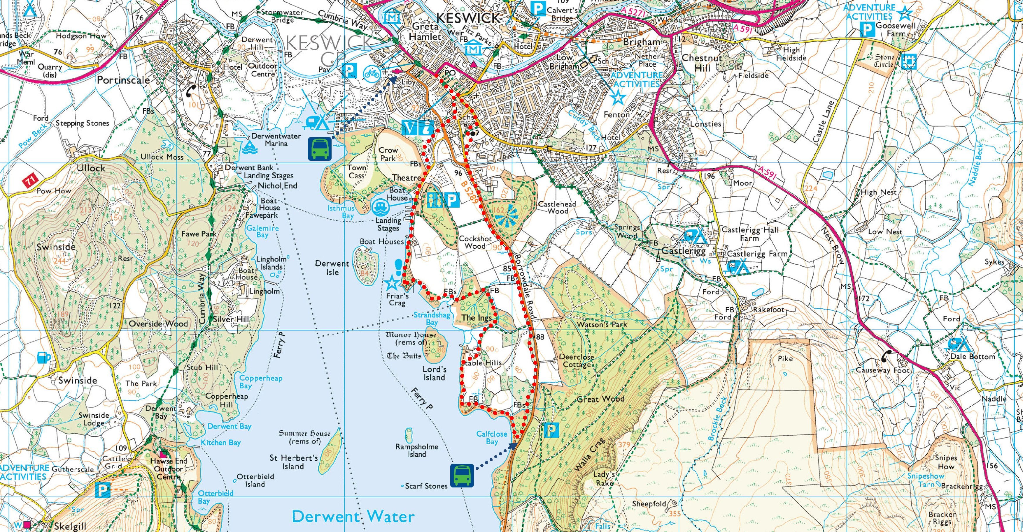 This pleasant walk from Keswick town centre along the east shore of Derwent Water, can either be a circular or linear route. There is a lot of interest along the way, including a walk through Hope Park, feeding the ducks at the boat landings, the views from Friar’s Crag and a picnic stop at the Centenary Stone.