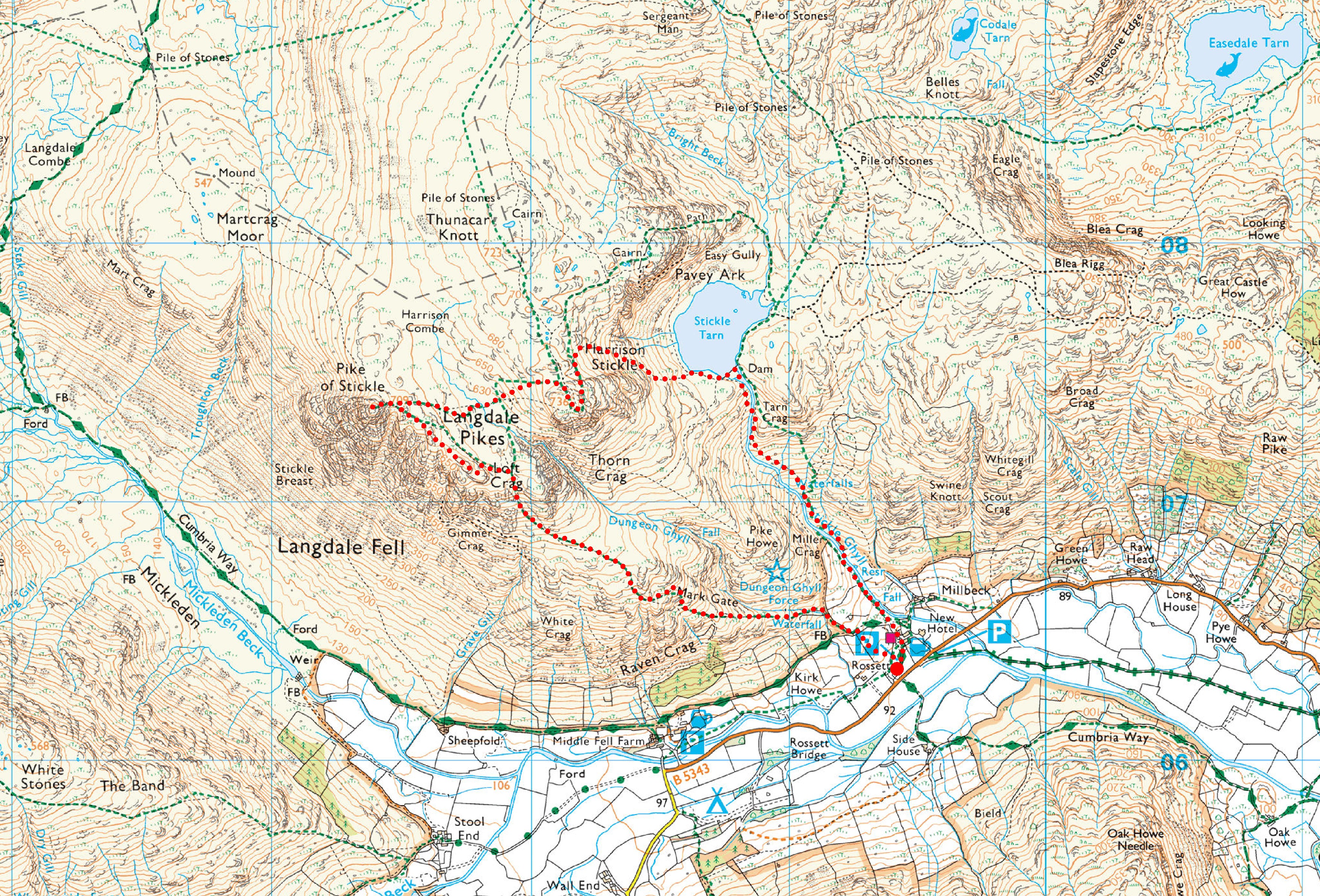 Millbeck (New Dungeon Ghyll) > Stickle Gill > Stickle Tarn > Harrison Stickle > Harrison Combe > Pike o’ Stickle > Loft Crag > Thorn Crag col > Mark Gate > Dungeon Ghyll Force > Millbeck
