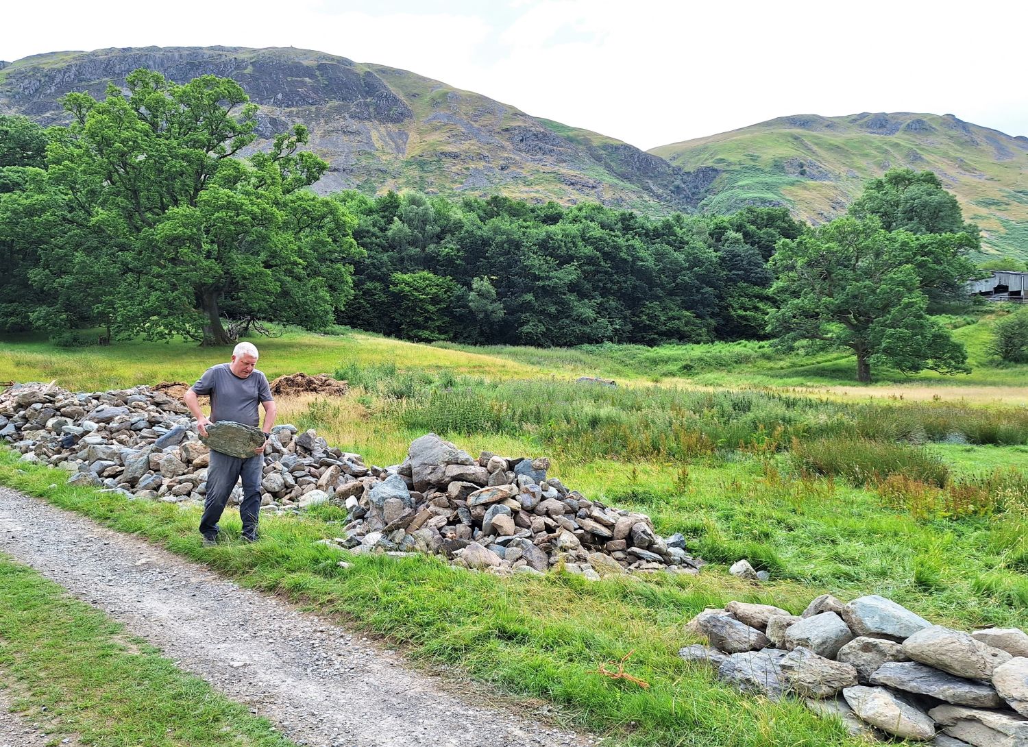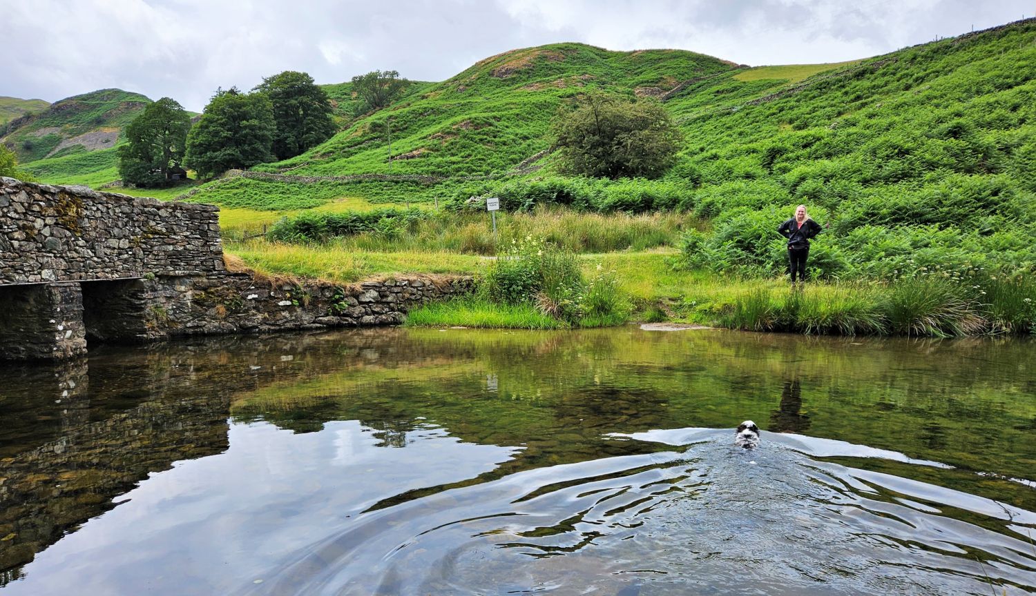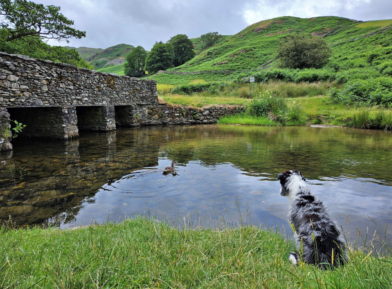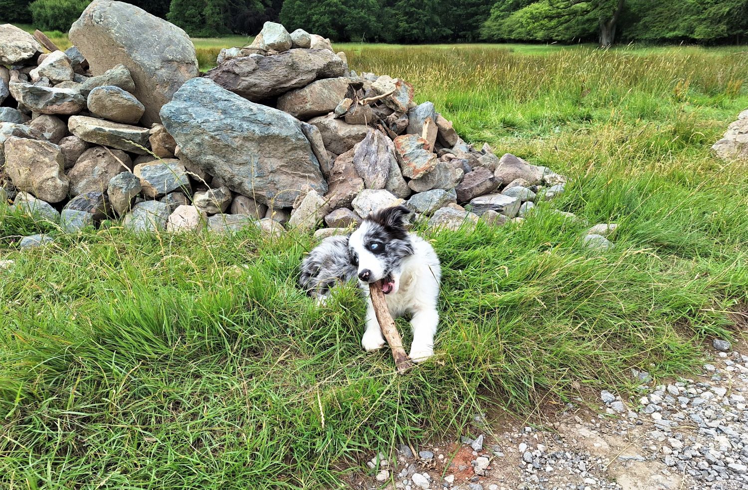 Today we headed off to Sharrow, a group of cottages on the south-east shores of Ullswater, to select some Lakeland stone for picking up the following day. There’s 70 tons available, but I’m only needing 4 tons for a garden project at home; I think 4 tons is enough for my back anyhow! While in the area we continued up the road and into Martindale to take Tika for a little walk. There he was introduced to some sheep belonging to Watercrag Farm, and an inquisitive duck in Howegrain Beck. He is so well-behaved around animals, even at this early age of 15 weeks. He’s doing well with the swimming too!