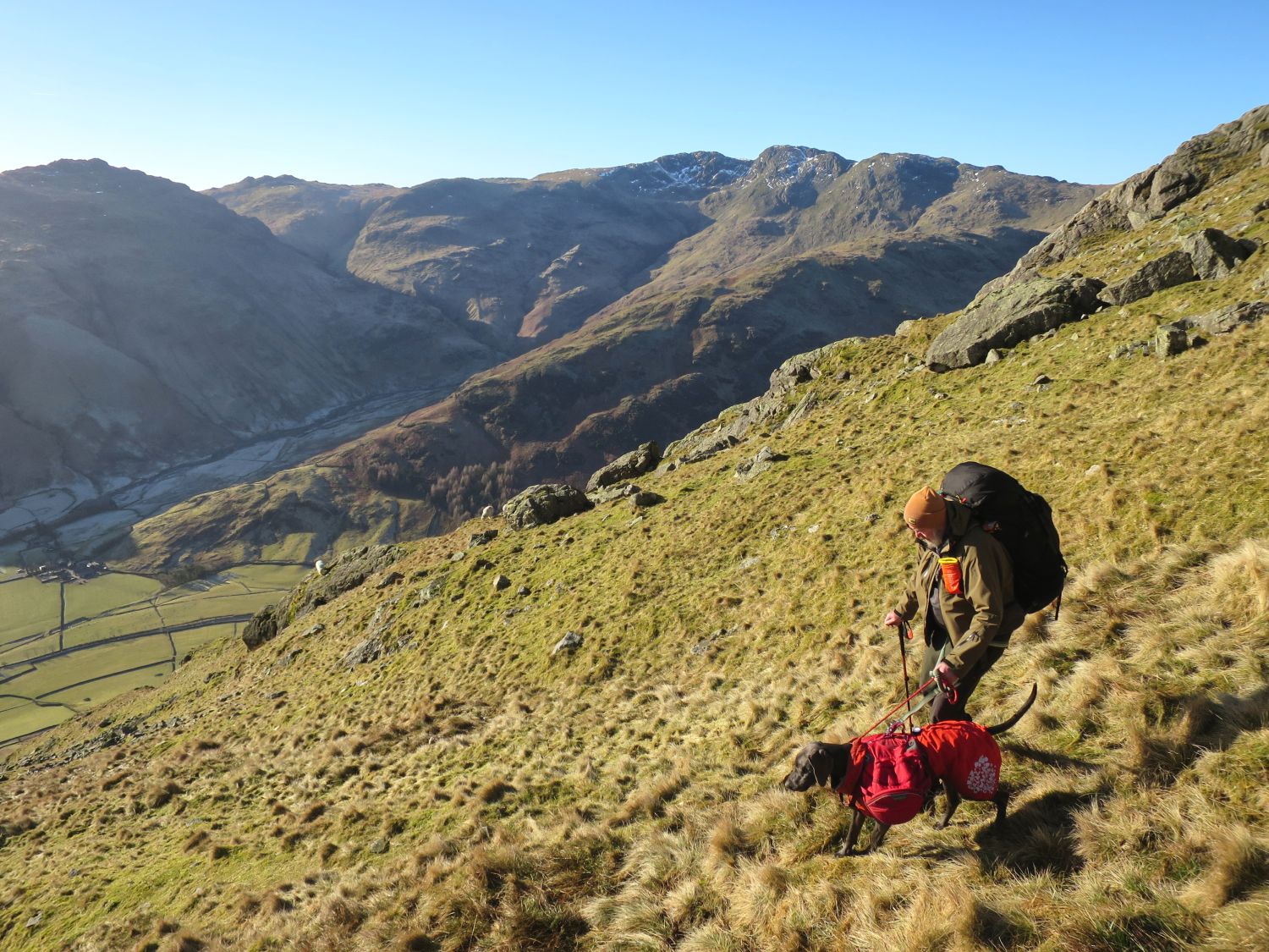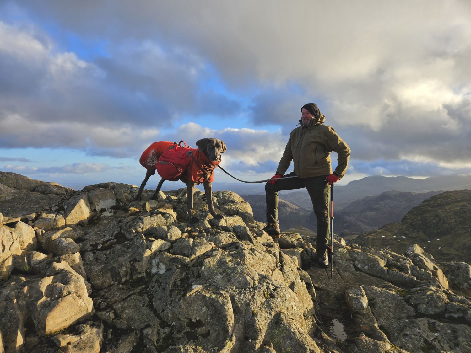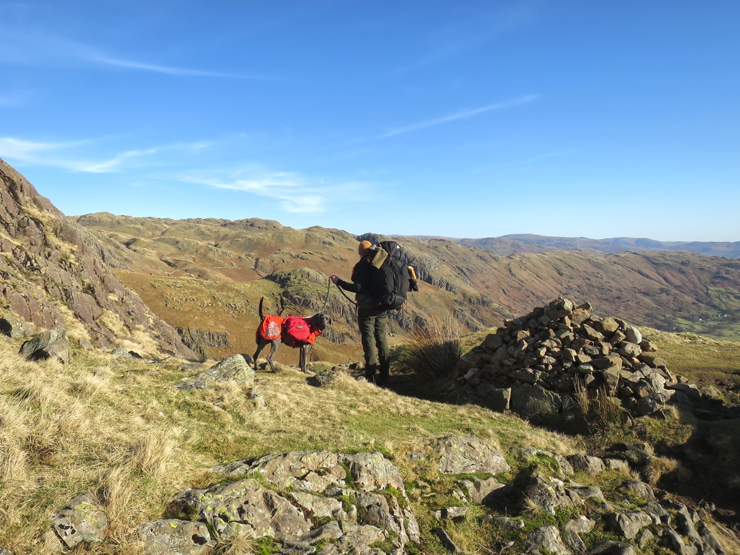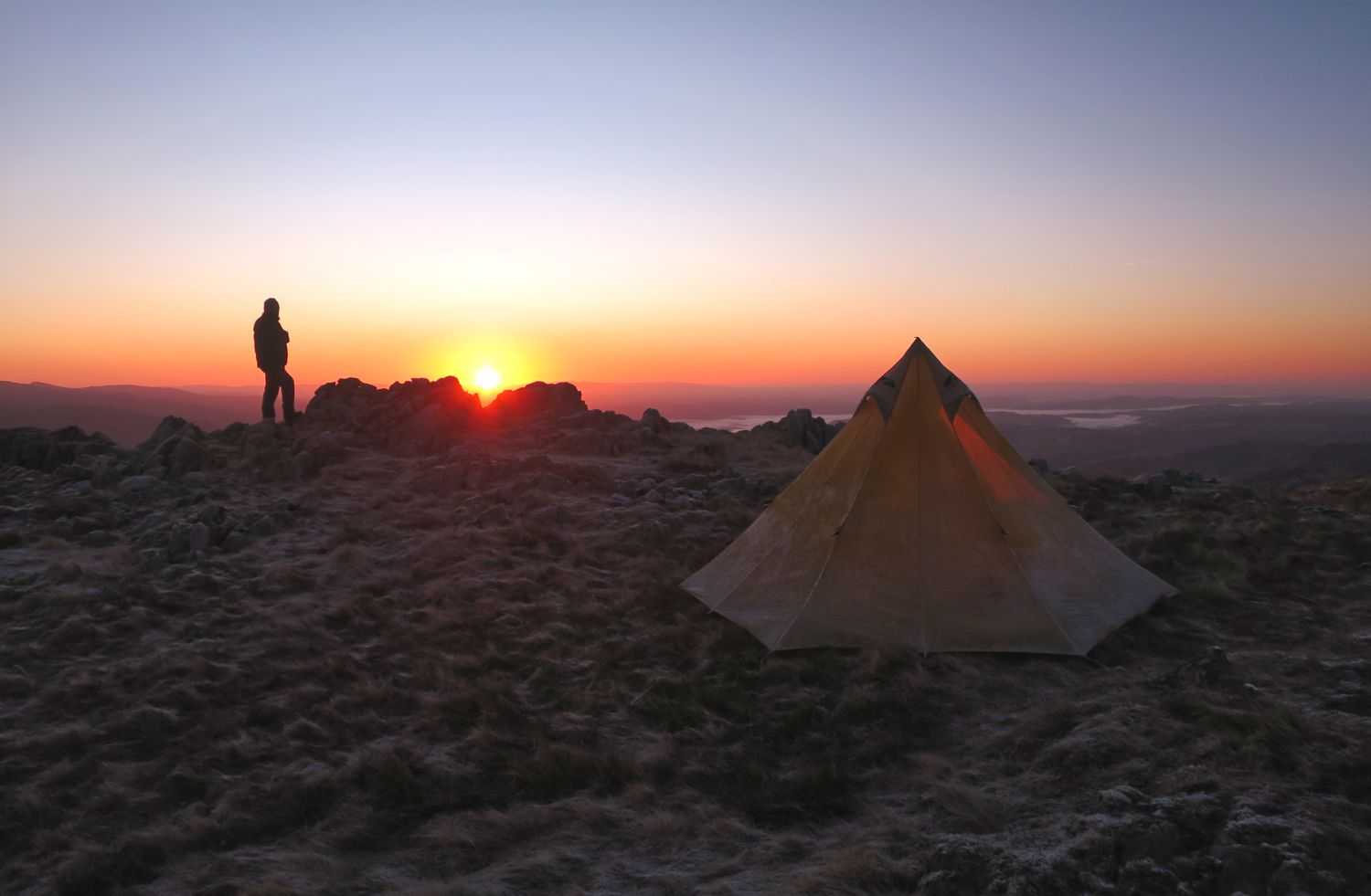 Keith Driver and his faithful friend, Reuben, joined me on a summit camp in the Langdales. We headed up Stickle Ghyll with the intention of camping near the summit of Sergeant Man. However, on arrival gut instinct took us over to investigate Codale Head and we found two nice pitches on the summit there. It was great to see the Golite Shangri-La 3 and the Kuiu Storm Star together. It was very cold and windy when we arrived, but the forecast predicted it to be clearer and lighter winds throughout the night. We woke the next morning to wonderful conditions; the tents were totally frozen over but the skies were clear and we witnessed a fantastic sunrise. We soon packed up and continued on our way to High Raise and Thunacar Knott. We were then spoilt on options for our return journey back down into the valley of Langdale. In the end we decided on the Mark Gate route.
