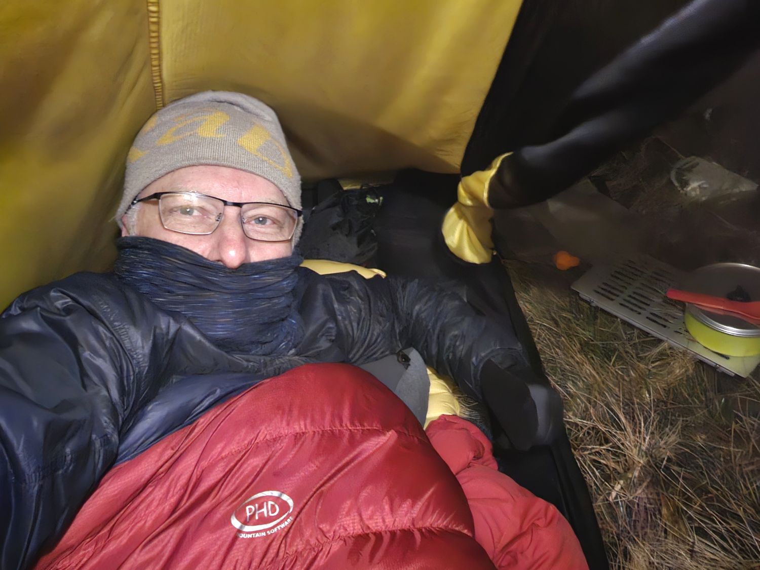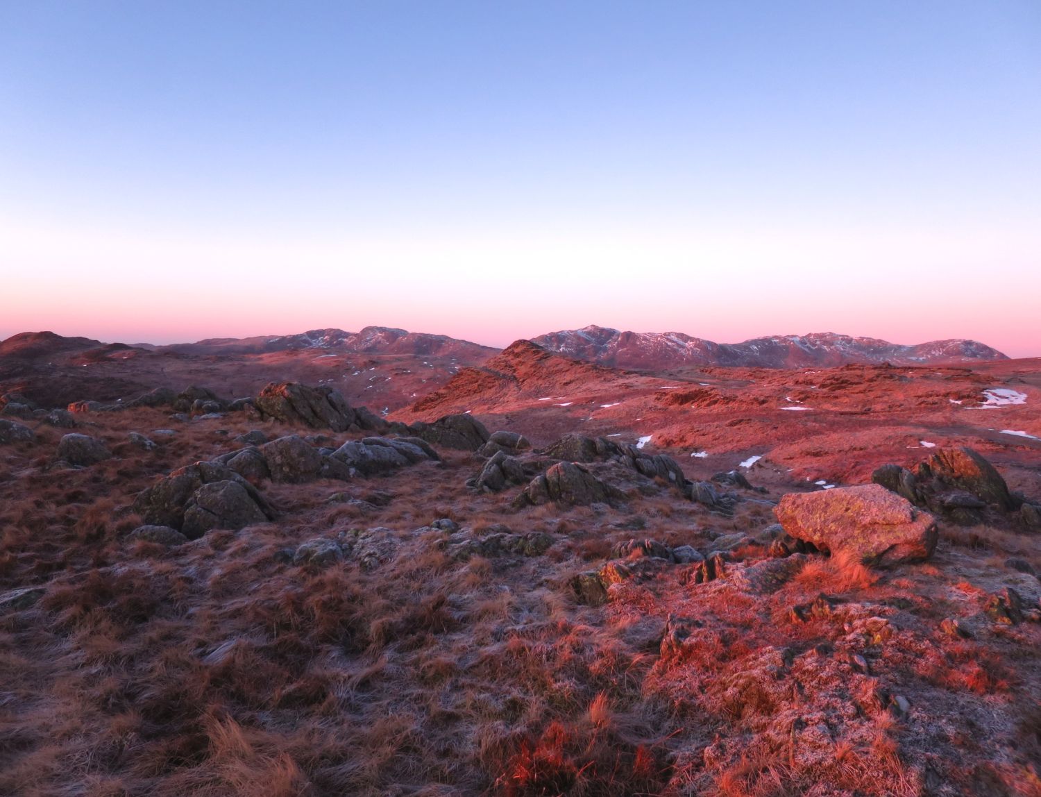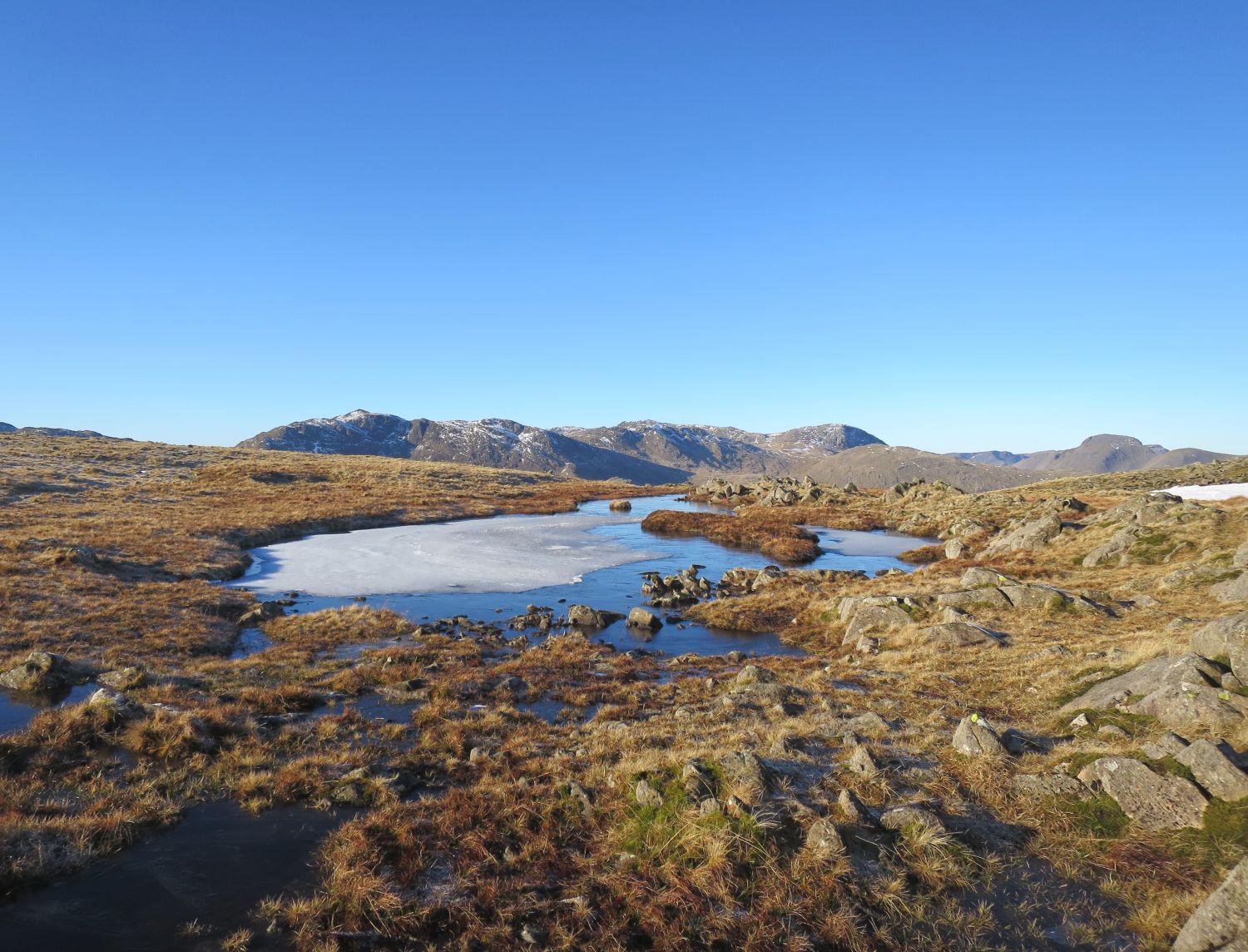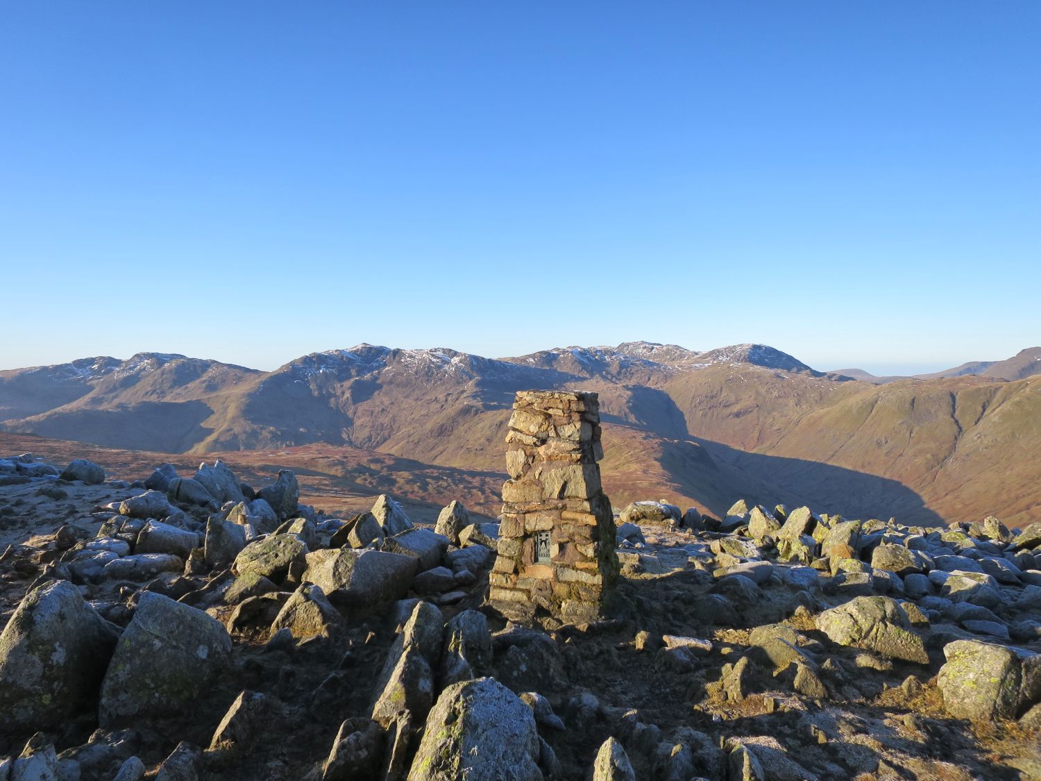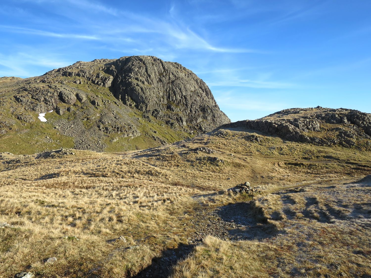 Keith Driver and his faithful friend, Reuben, joined me on a summit camp in the Langdales. We headed up Stickle Ghyll with the intention of camping near the summit of Sergeant Man. However, on arrival gut instinct took us over to investigate Codale Head and we found two nice pitches on the summit there. It was great to see the Golite Shangri-La 3 and the Kuiu Storm Star together. It was very cold and windy when we arrived, but the forecast predicted it to be clearer and lighter winds throughout the night. We woke the next morning to wonderful conditions; the tents were totally frozen over but the skies were clear and we witnessed a fantastic sunrise. We soon packed up and continued on our way to High Raise and Thunacar Knott. We were then spoilt on options for our return journey back down into the valley of Langdale. In the end we decided on the Mark Gate route.