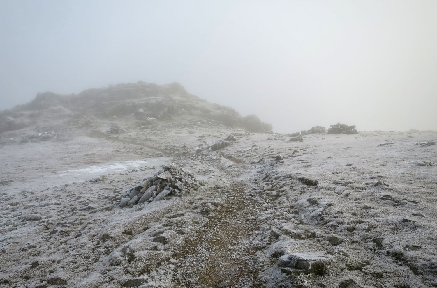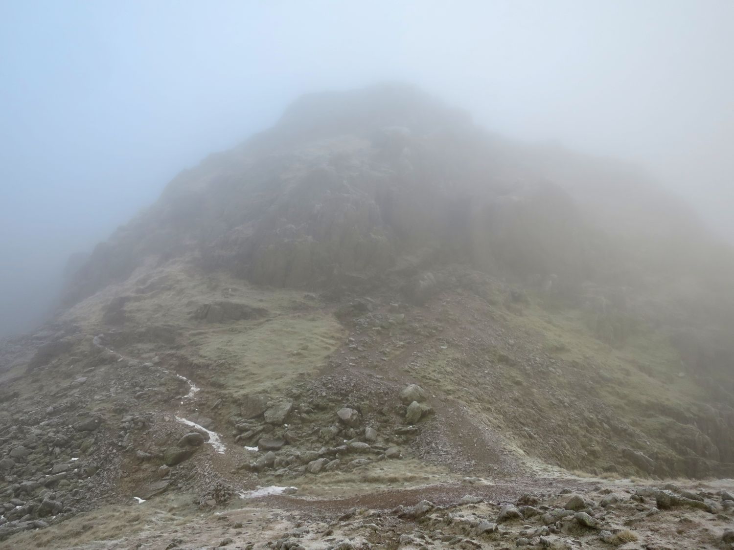 There are two images showing the pitch from the summit cairn. The following image shows the highest Crinkle (Long Top) appearing through the cloud. The ‘bad step’ was not quite visible though. On the summit plateau of Long Top a lone walker can just be seen standing at the north cairn. I then continued along the tops towards Shelter Crags, where I camped two weeks prior, before descending back to Old Dungeon Ghyll via The Band. I then met up with Jaclyn and Tika for coffee, chips and gravy at the pub.