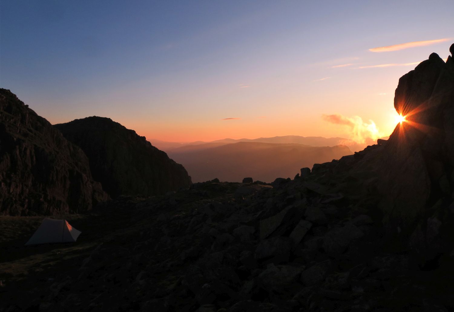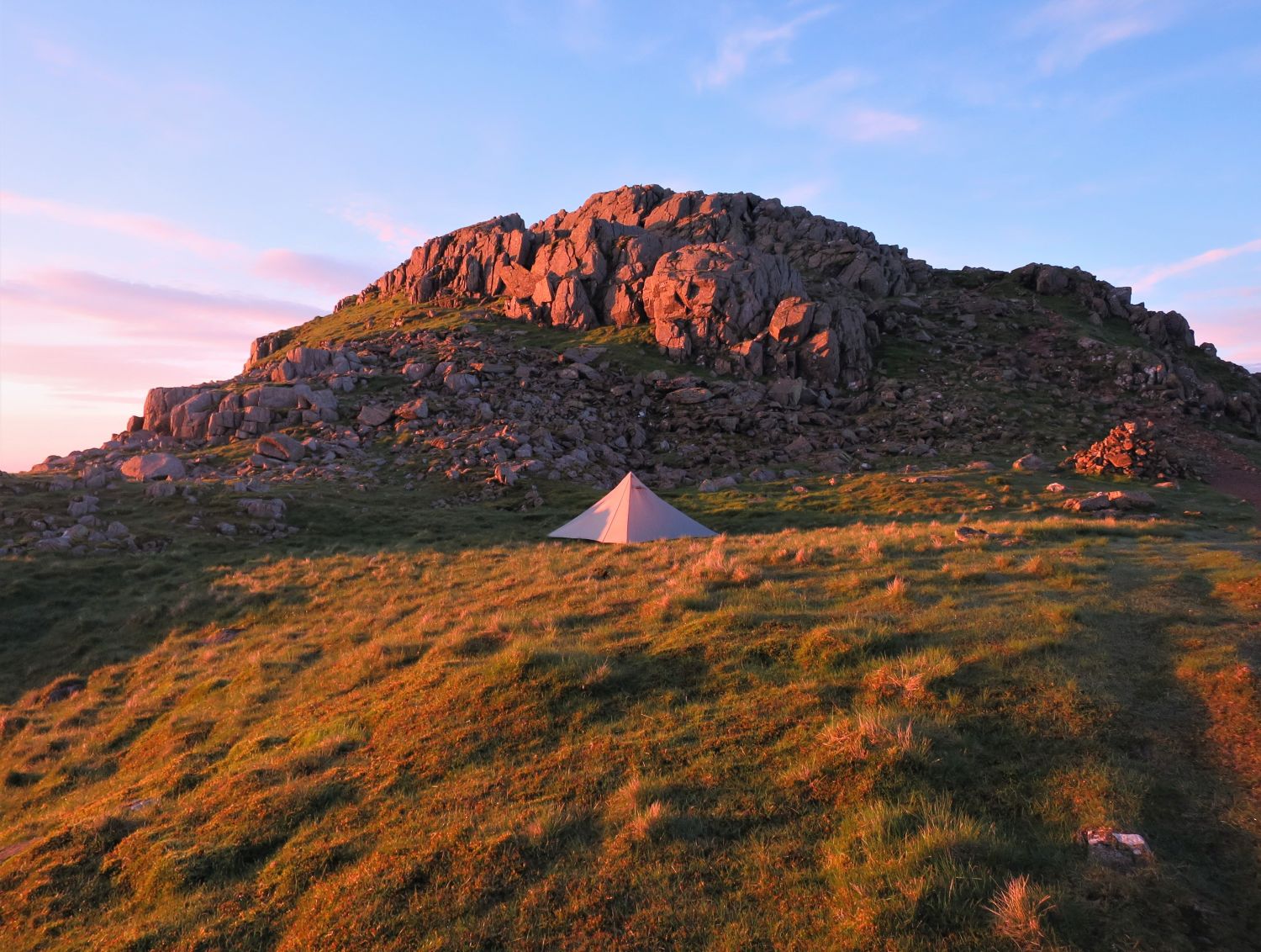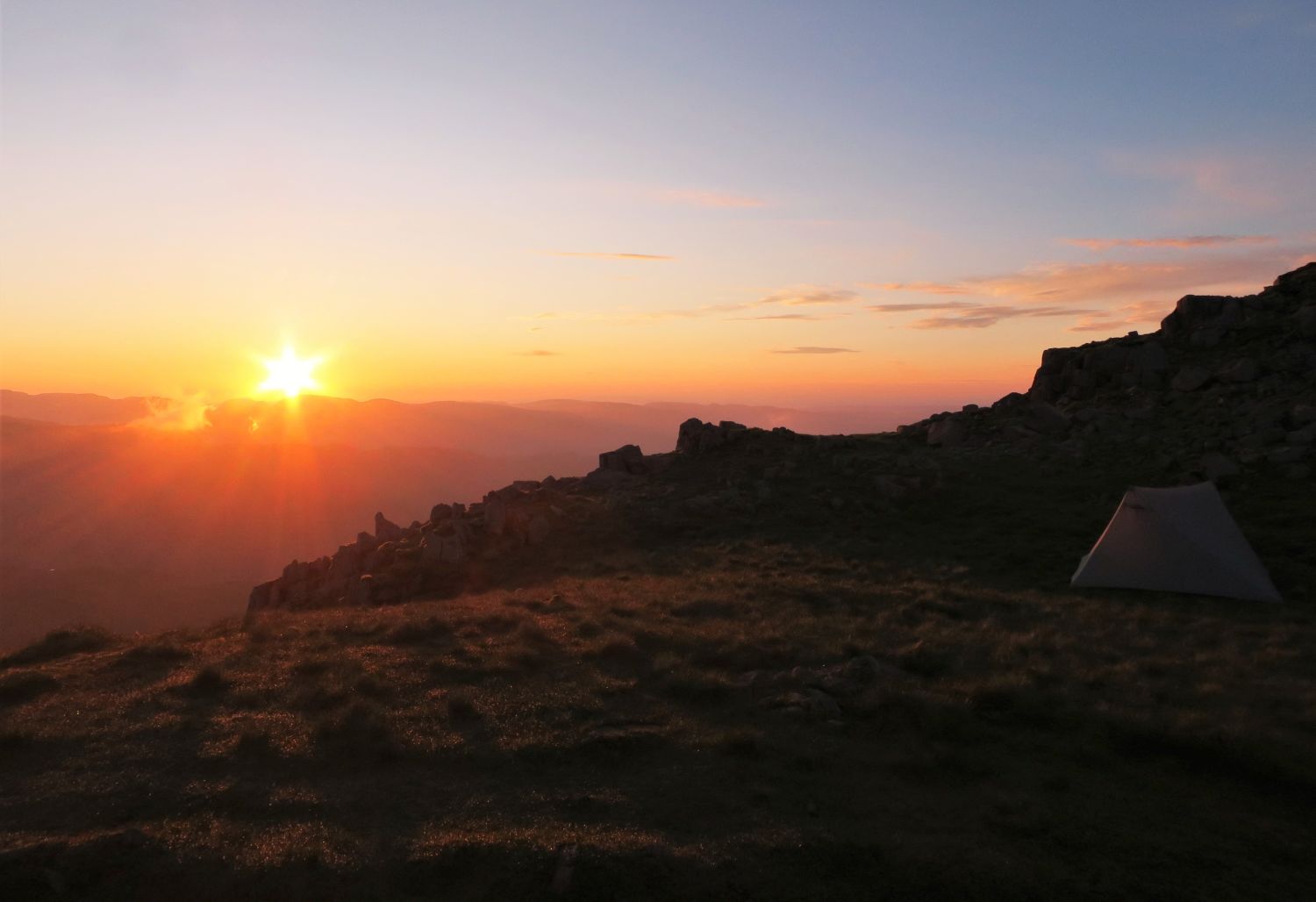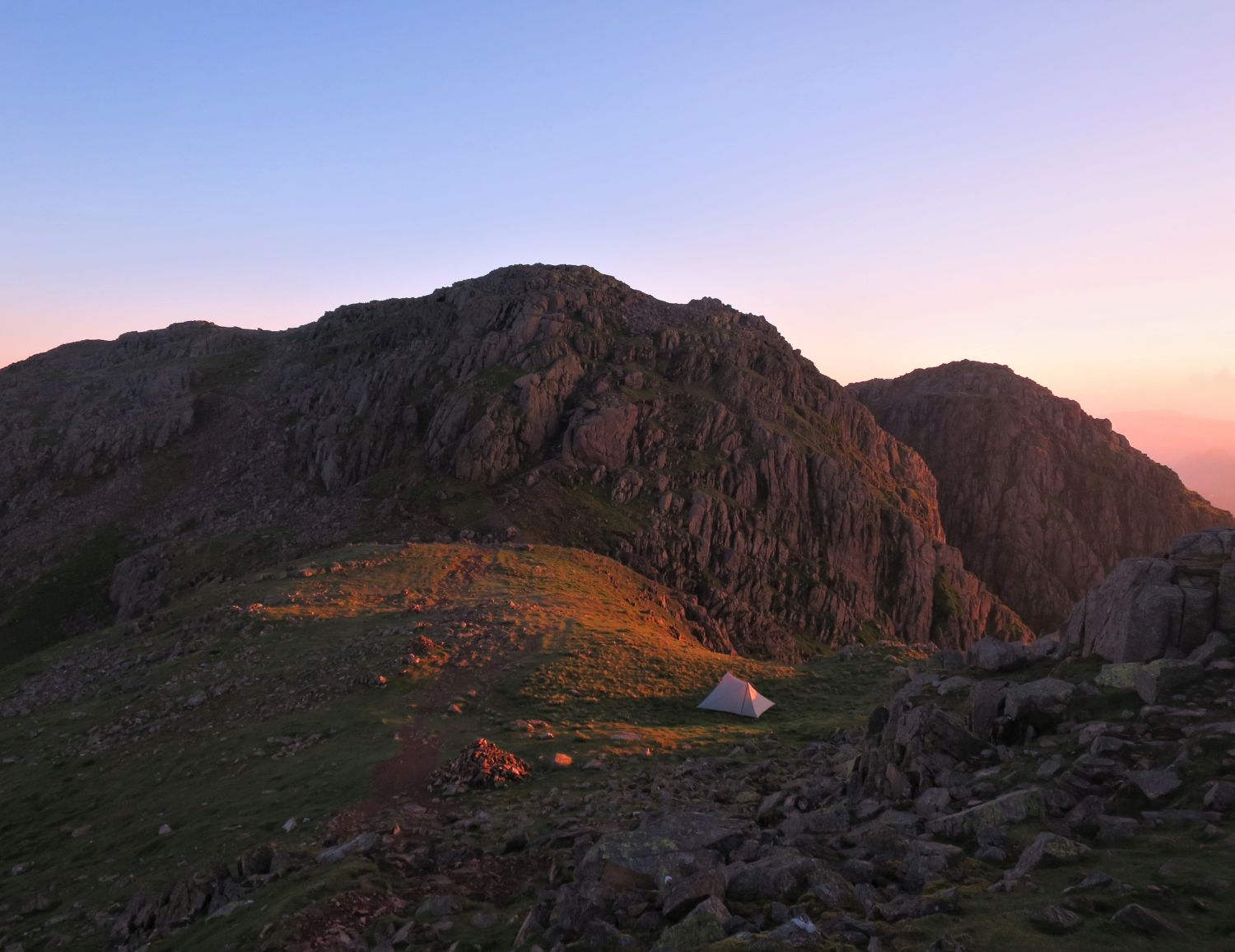 Some of my favourite photos from my wild camp on Crinkle Crags, which was the first night out for the Durston X Mid 2. The weather forecast for the evening was easterly winds and clearing, but on arrival to the first top from the north, Gunson Knot, I found myself in thick clag and the wind had dropped to nothing. It was a very moody and creepy atmosphere, as I negotiated the rocky knolls and traverses. Thankfully I know these five summits very well, and I knew where to take the short cuts and where to find water. I found a lovely spot on the ascent of the last Crinkle, previously known as “Flesk”, and pitched above the col and straight opposite the ‘Bad Step’. It was a quick pitch and it wasn’t long until cooking commenced. There was a brief moment of sun peeking through above the Scafells that lit up my location, so I quickly jumped out of my abode to take a photo of the tent and the summit of Flesk. What followed in the morning was simply spectacular, but I’ll let the photos show my reward for all the effort.