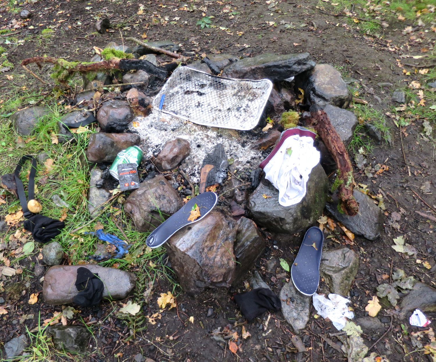 At Black Moss, we came across about a dozen fire pits and some litter. One pit, on top of a rocky outcrop, was easy enough to clear away, but the others were much harder to dismantle. Many contained nails and other bits of metal. The largest pit still had the charred remains of a metal gate—the same one I’d seen online back in June 2023 (photo attached).