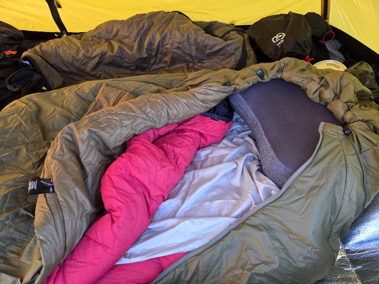 The photo from inside the tent shows a new sleeping pad and an overbag. At the bottom of the system I use radiator foil from Screwfix, which I’ve been using for over ten years now. It’s the best product out there for the job. On top of that is a new sleeping pad from Zenbivy, which is very comfortable — far more comfortable than the lightweight Thermarest pad I’ve been using all these years.