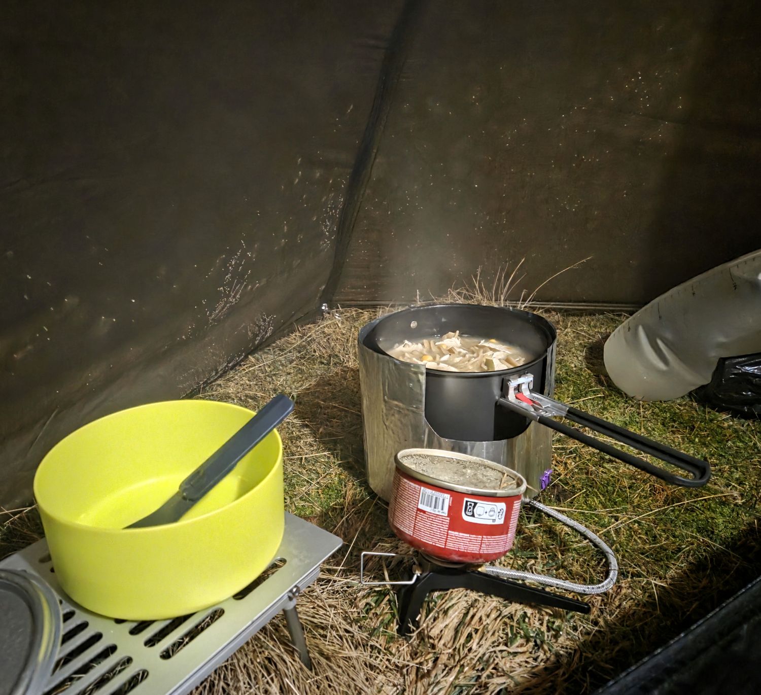 Another thing, if anyone is using the MSR WindPro II stove, a good tip is to cut an aluminium disc which will then slot between the feet. This will reflect heat and protect the grass.