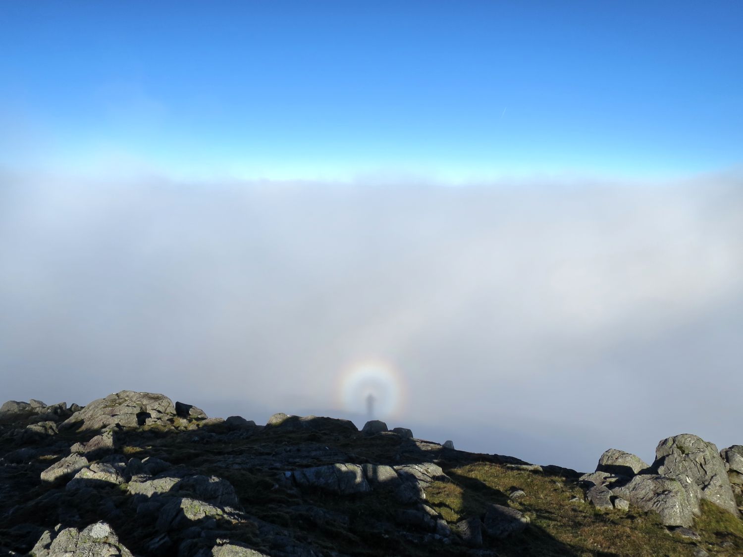 The top of the inversion layer was rising quite quickly as I was packing my tent away on Green Gable, so I decided to follow it up onto Great Gable. I managed to catch some Broken Spectres and fog bows before it too became engulfed by the inversion. A chap sent his drone up briefly to check which tops were still visible, and to our surprise, only Scafell Pike was above the layer. That was around 11 a.m.