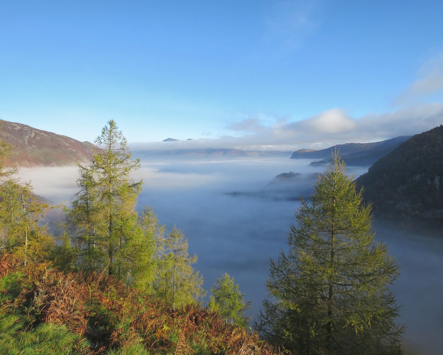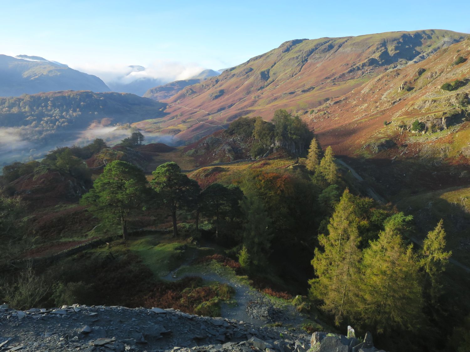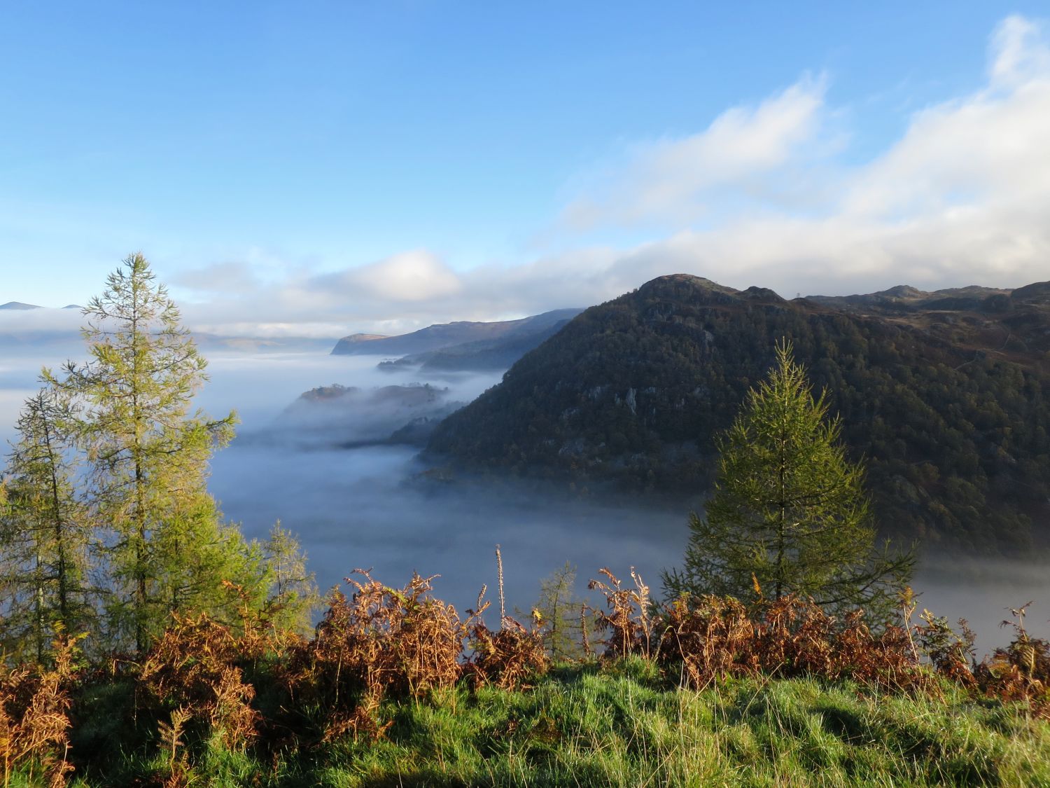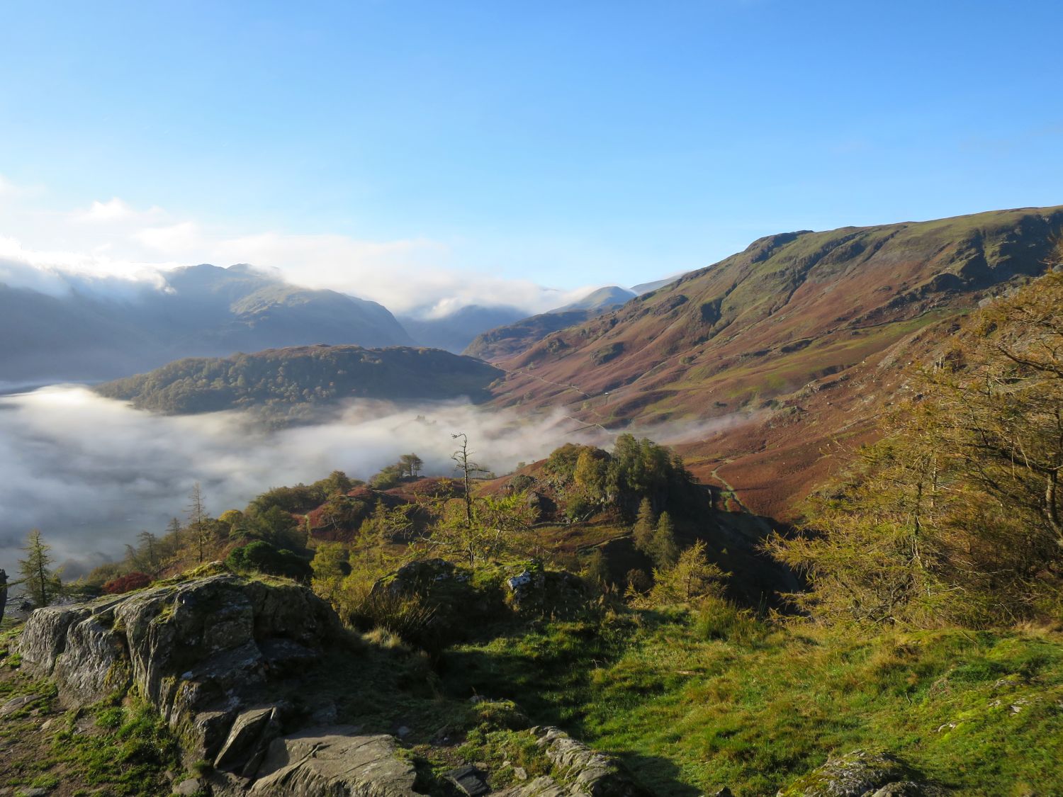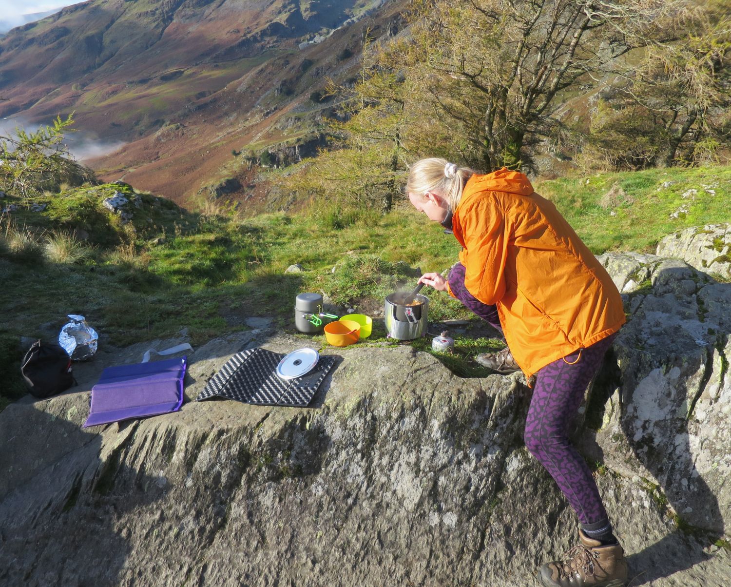 Cooking lunch on the summit of Castle Crag, with outstanding, atmospheric views stretching across the Vale of Keswick, Derwent Water, and the surrounding fells. The patchwork of autumn colours in Borrowdale never disappoints — a perfect reward for such a short climb.