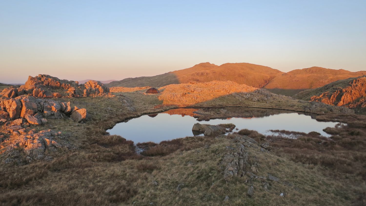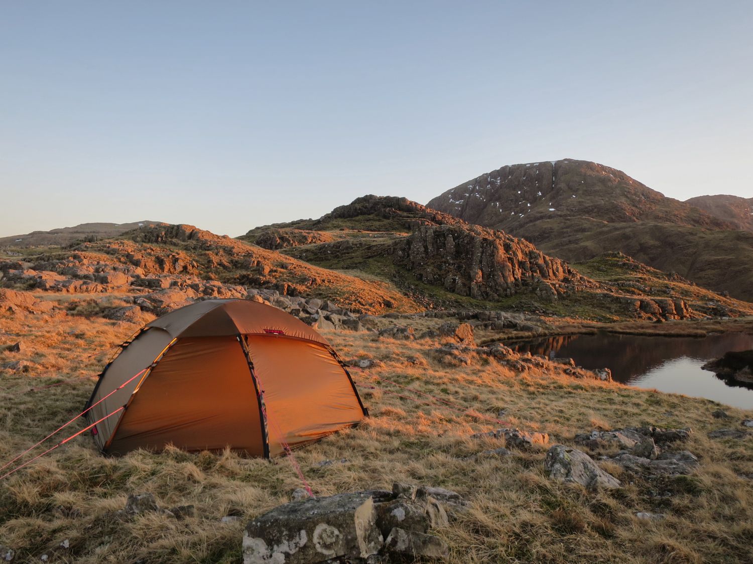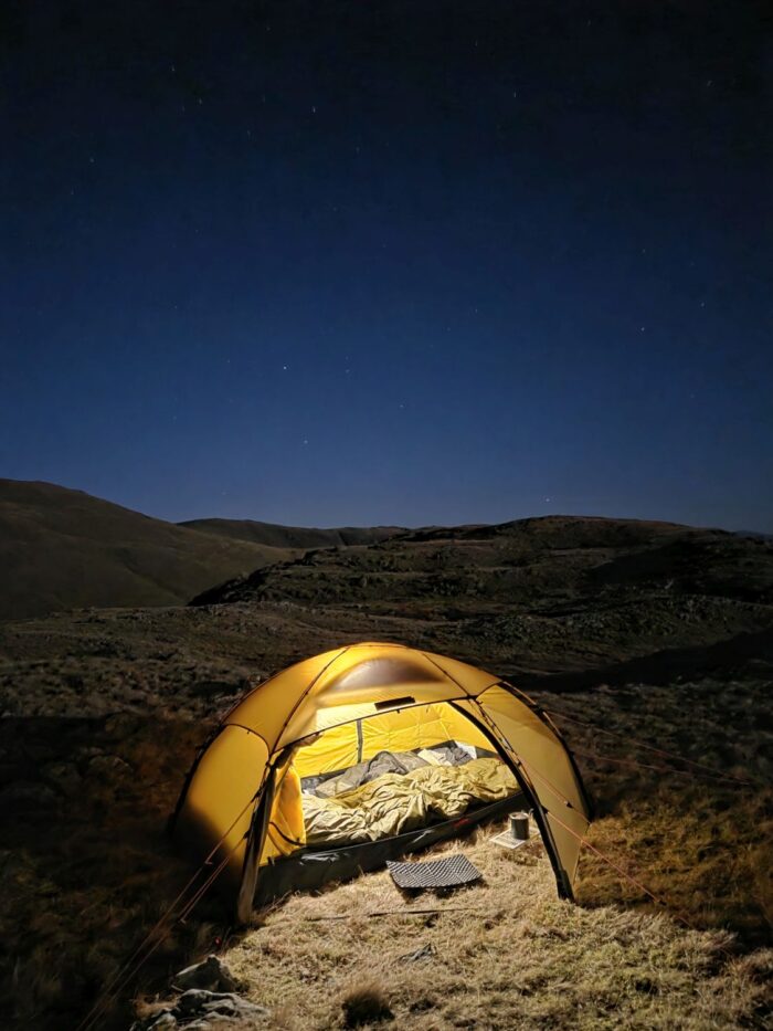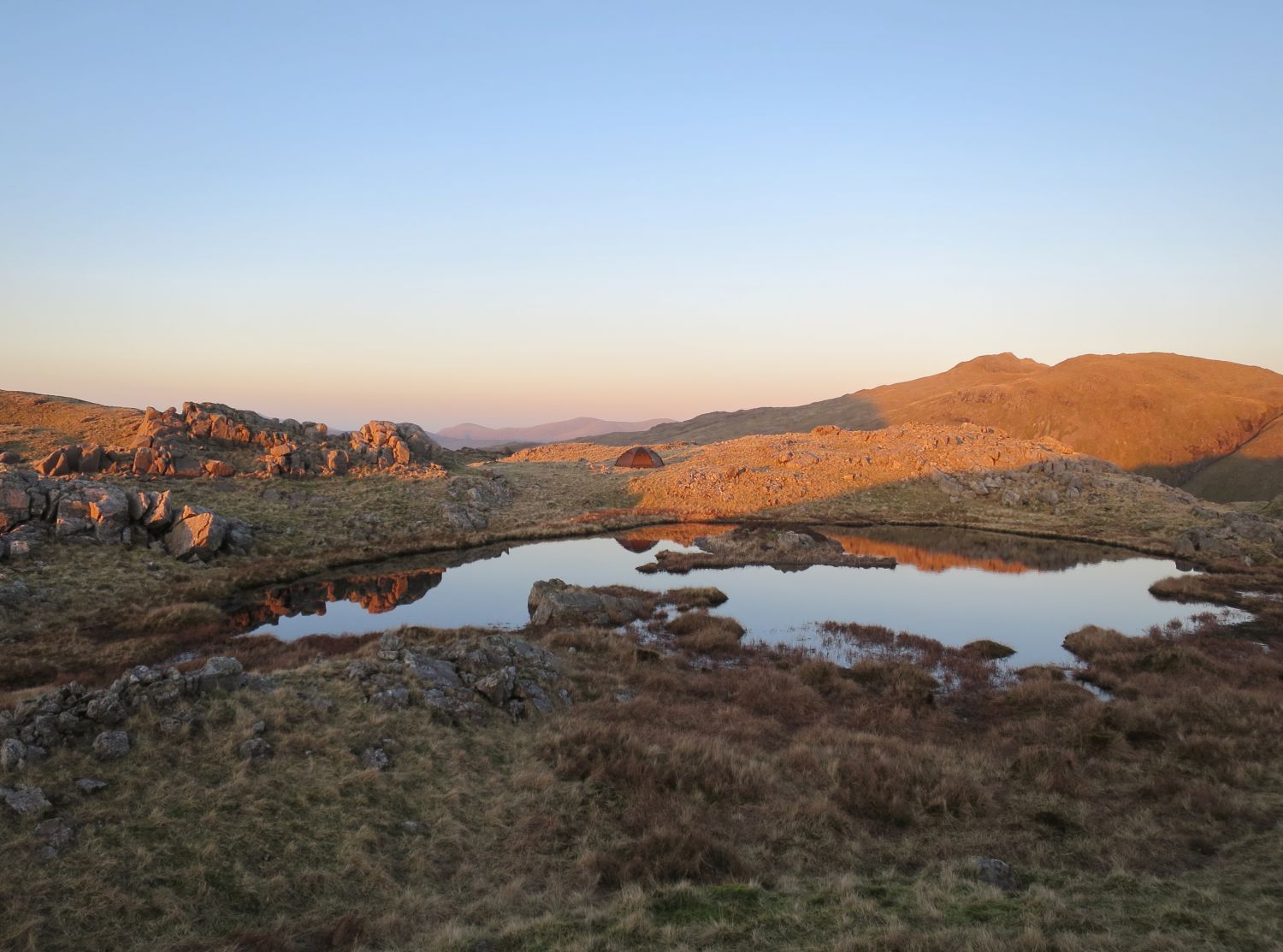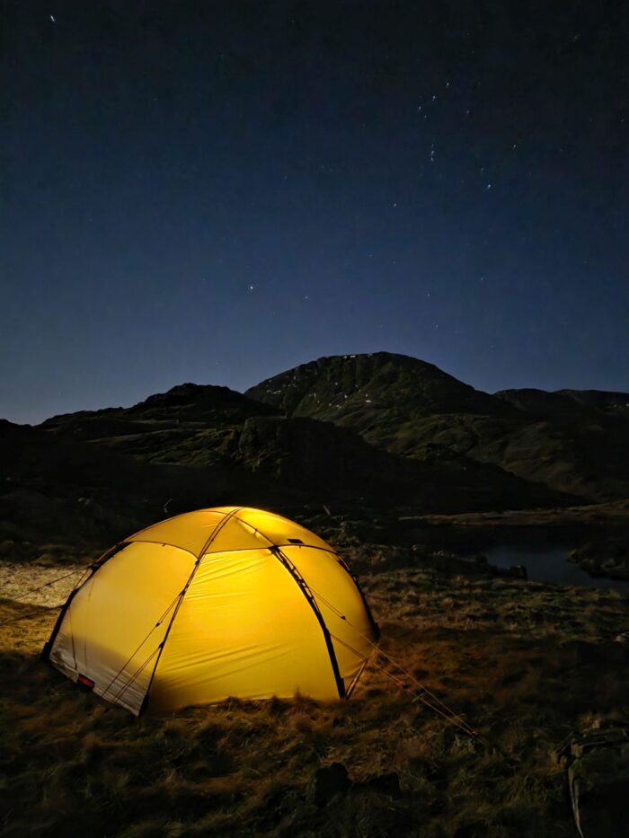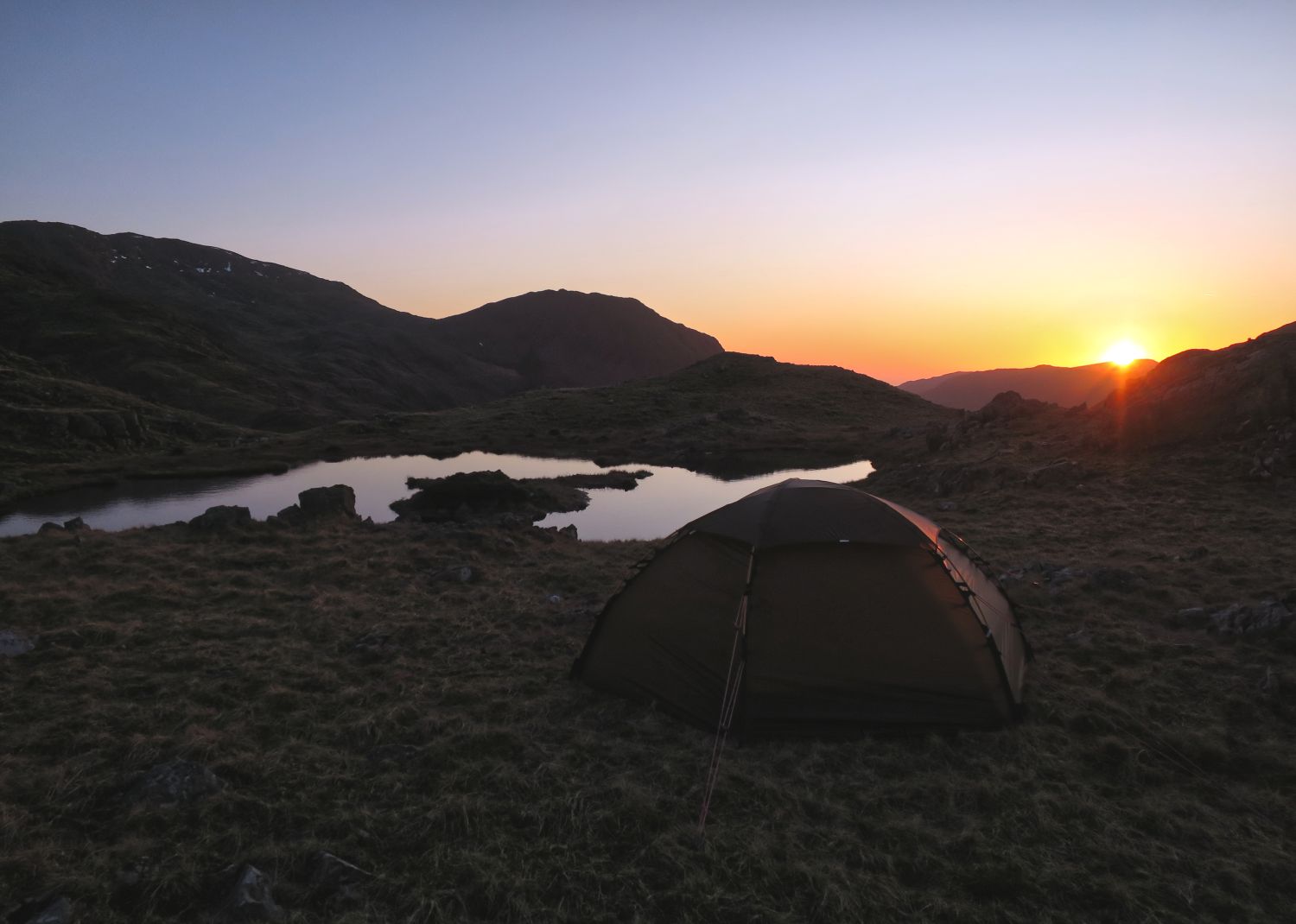 Sadly, I had no luck at all and ended up pitching on the other side of the main summit of Seathwaite Fell, which was too far away from the main path for my Lakeland Way trip. However, the camp beside an isolated tarn was still a wonderful experience. The sausage casserole certainly made all the effort worth it.