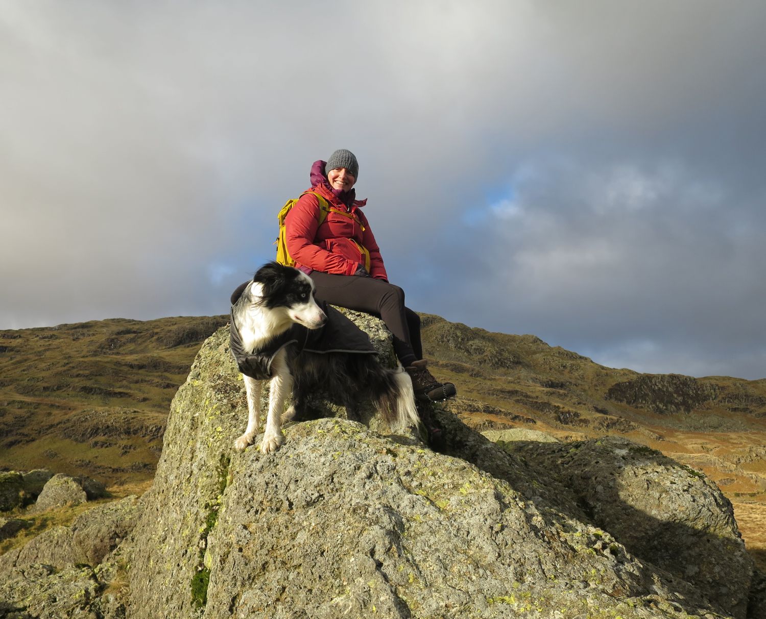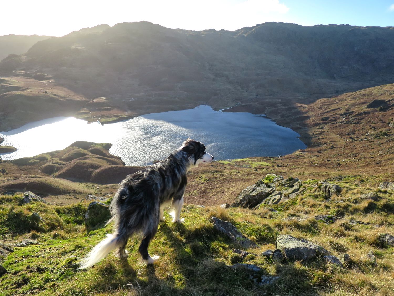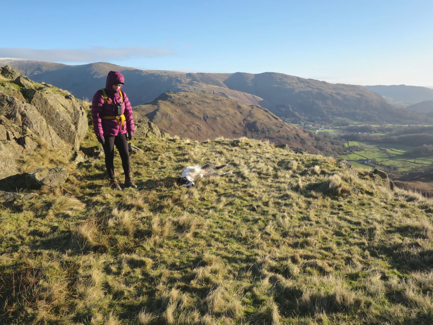 Along the ridge and on Greathead Crag, we found a lovely flat, grassy shelf for a future camp, looking out over the Vale of Grasmere. Tika certainly approved and even checked which way he’d lie in the tent.