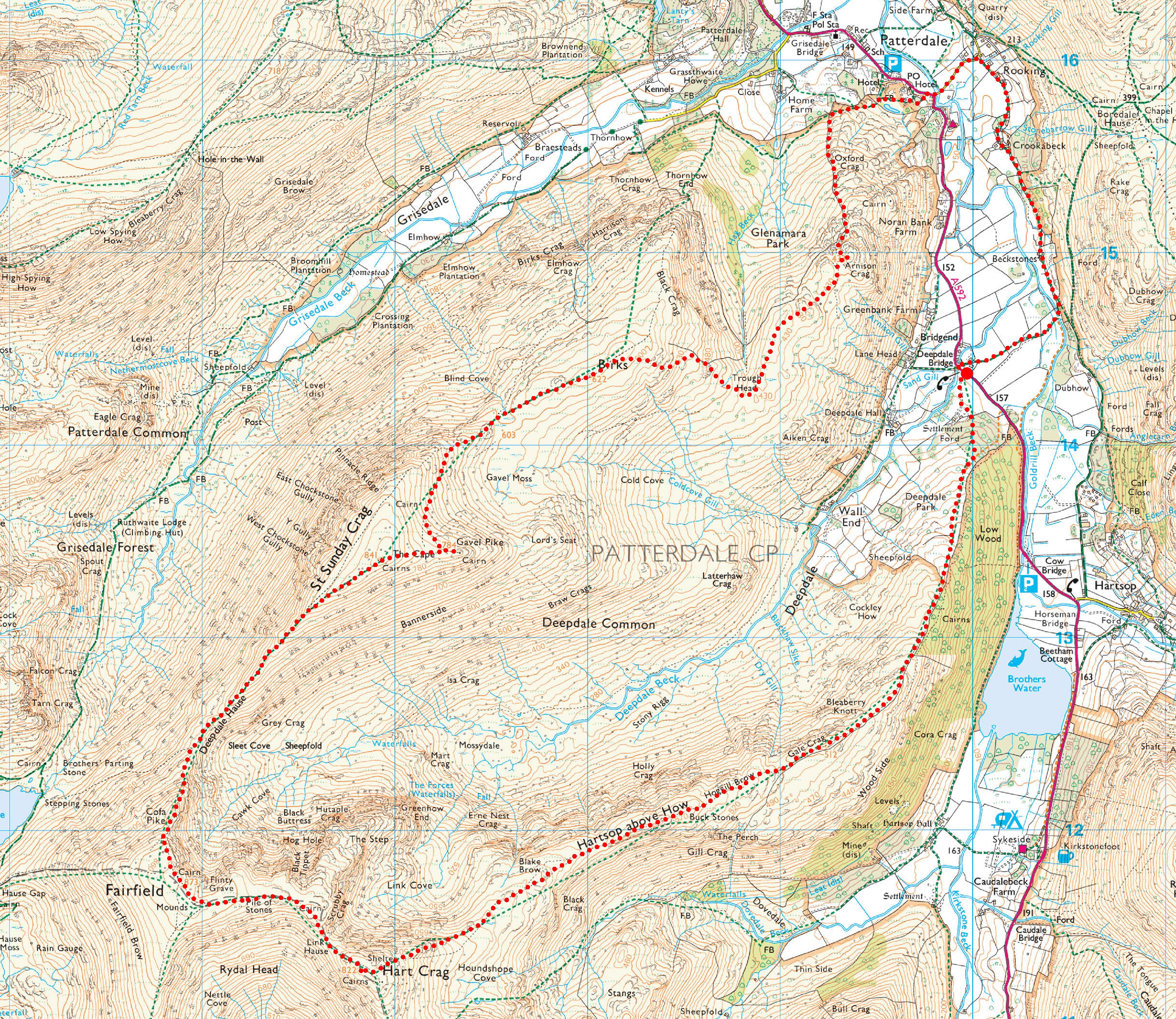 Bridgend > Deepdale Park > Gale Crag > Hoggill Brow > Hartsop above How > Blake Brow > Hart Crag > Scrubby Crag > Fairfield > Cofa Pike > Deepdale Hause > St Sunday Crag > Gavel Pike > Birks > Trough Head > Arnison Crag > Patterdale > Rooking > Crookabeck > Beckstones > Bridgend