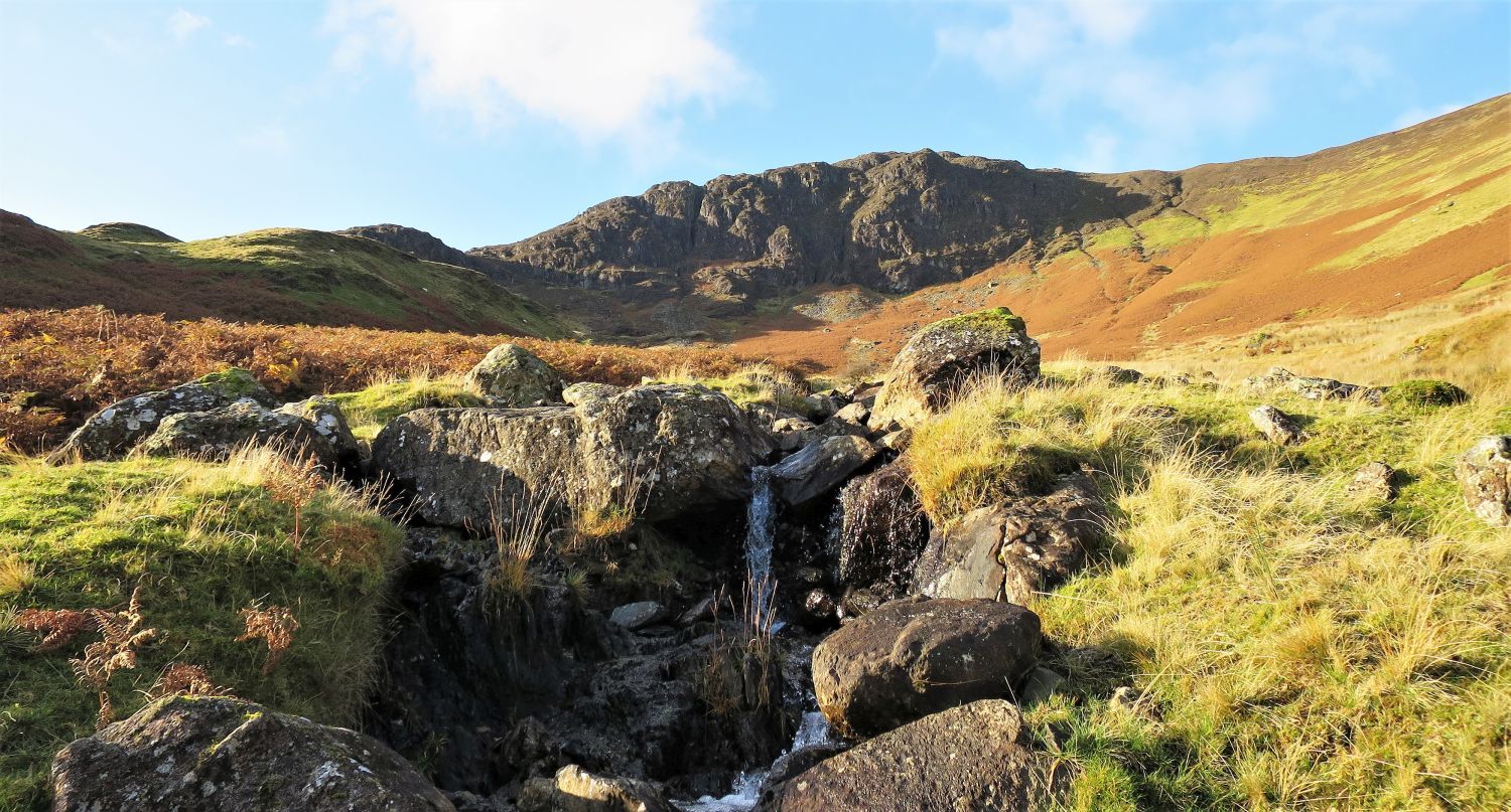 Rather than continuing further into Tongue Gill, head slightly right and follow an old miners’ path towards Rigghead Hut and the lower quarries.