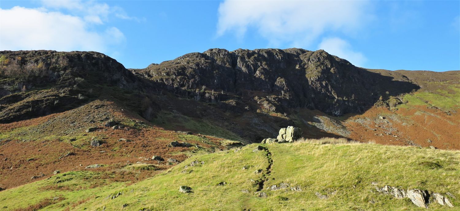 Follow the Cumbria Way for only a short distance before joining a path that leads to the ridge of Cockley How and Blea Crag. Cockley How is the bracken-clad hill in front of the escarpment of crags, the larger of which is Blea Crag. Just above Cockley How, the early morning sun forms a near horizontal line in the area of High White Rake; this rake is our route onto Blea Crag and High Spy beyond.
