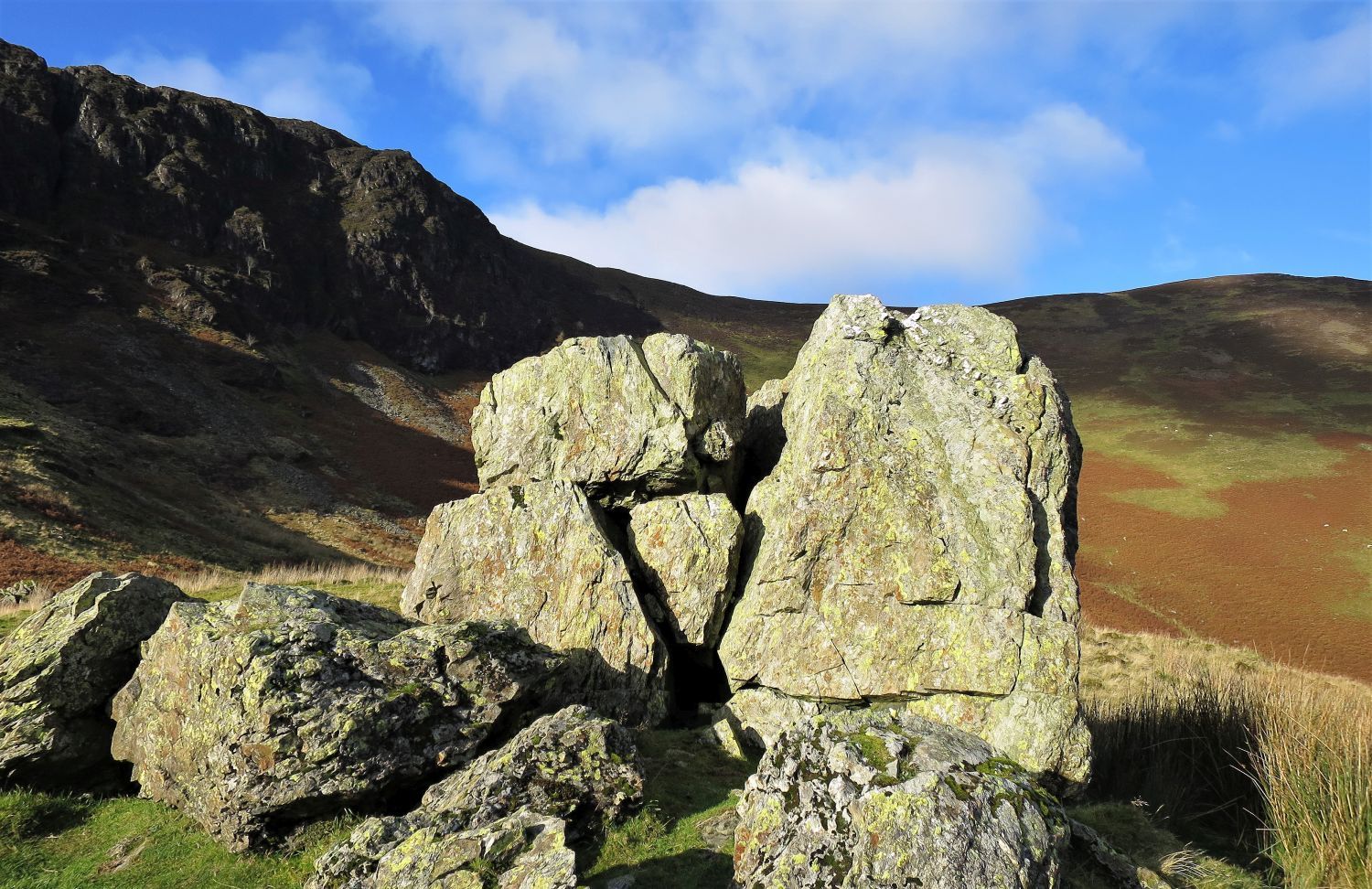 A short distance away, above the ‘viewpoint’ top, large boulders crown the summit of Cockley How. The near horizontal shadow below Blea Crag shows the direction of High White Rake, however, the vertical cleft in the centre of the picture will be our next objective.