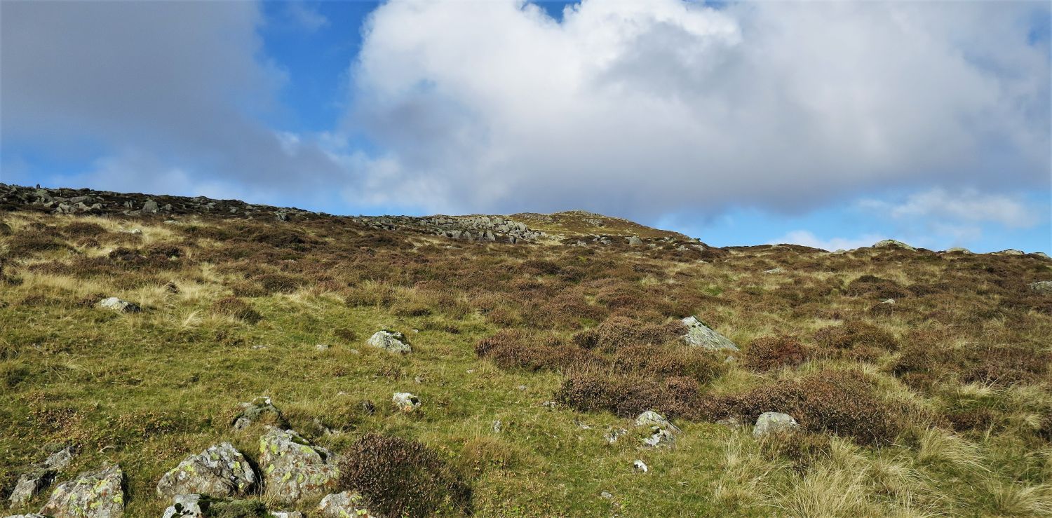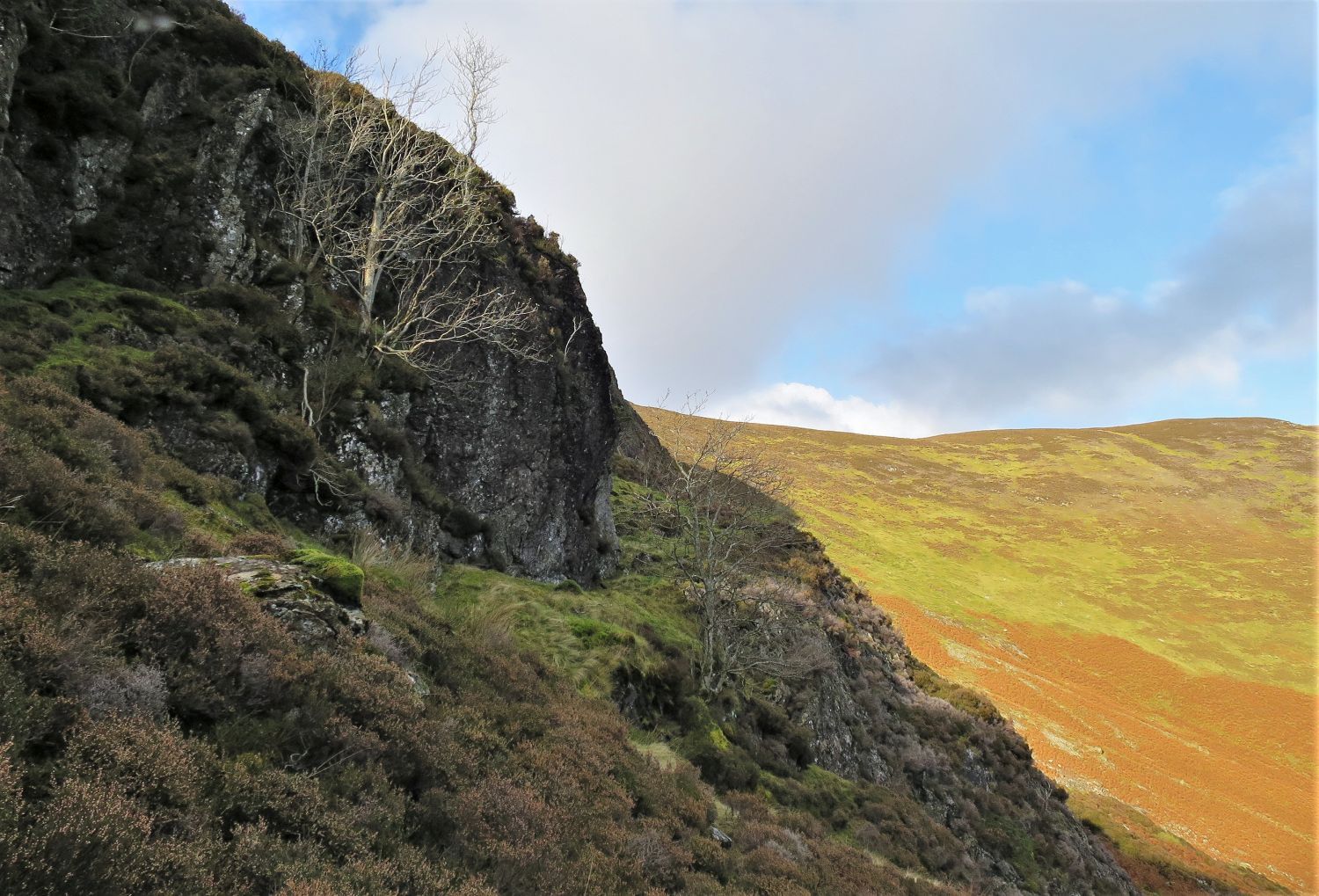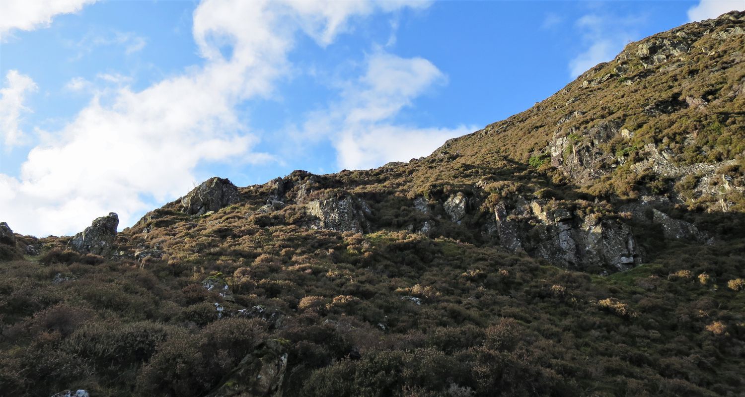 Once at the head of High White Rake, on your right take a pathless route up onto a heather and rock terrace; this will save any loss of height. A short distance away a narrow path in the heather suddenly appears and traverses towards the ‘amphitheatre’ above.