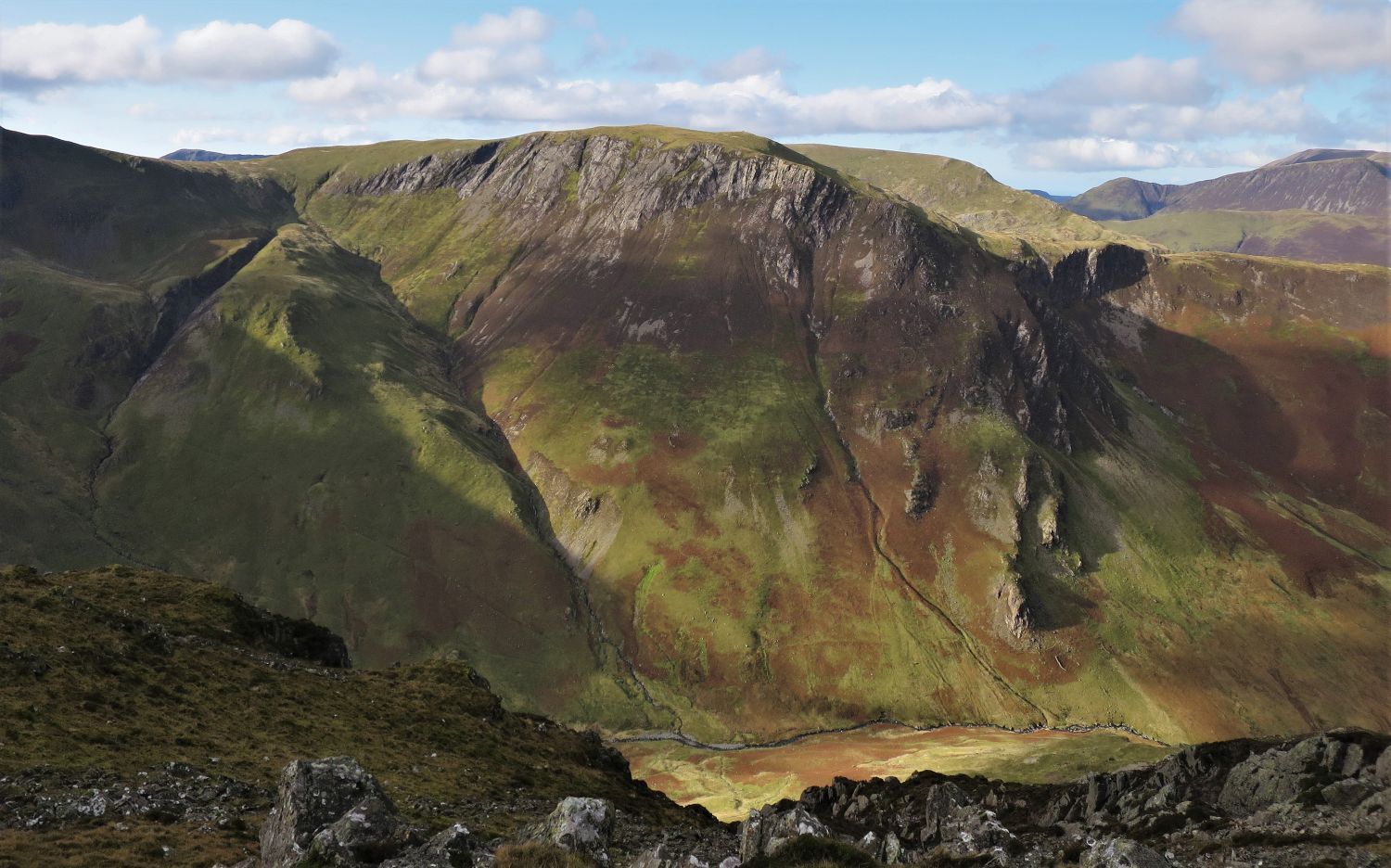 The word ‘fell’ associated with most of the Lakeland fells, seems appropriate, while the word ‘mountain’ seems ambitious; the view of Hindscarth from Eel Crags disputes the latter though.