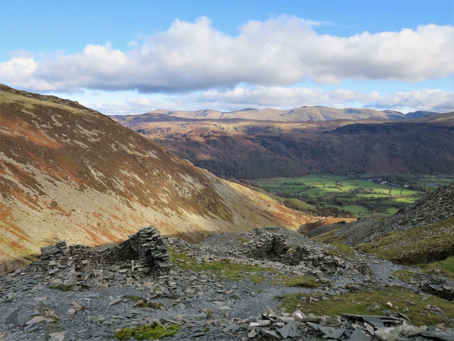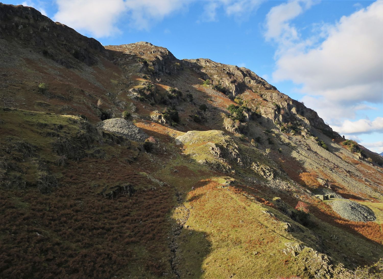 To our left, on the lower eastern flank of High Spy, there is much evidence of early slate mining.