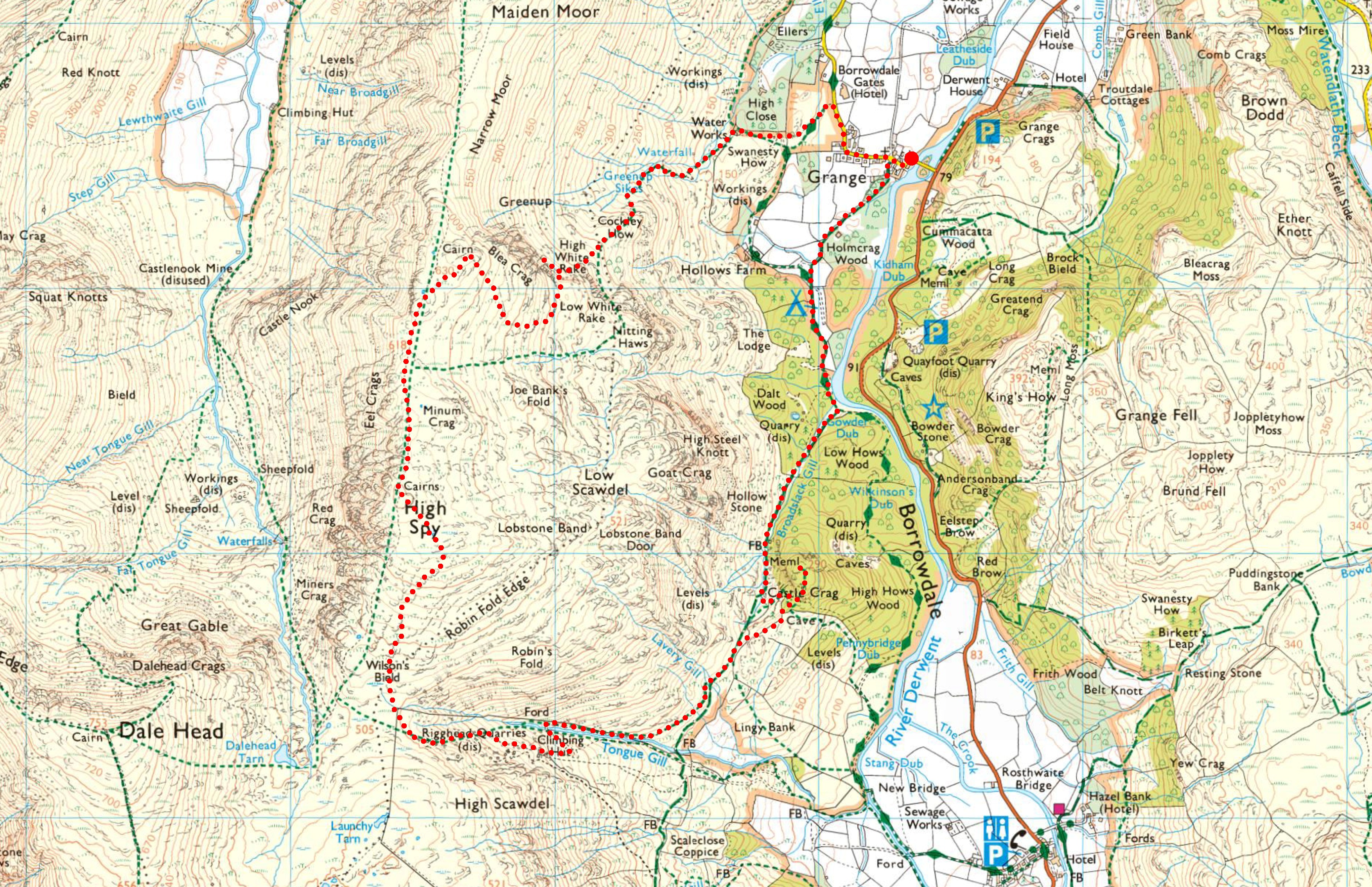 Grange > Swanesty How > Cockley How > High White Rake > Blea Crag > High Spy > Robin Hood Edge > Rigg Head > Rigghead Quarries > Tongue Gill > Broadslack Gill > Castle Crag > Broadslack Gill > Gowder Dub > Grange
