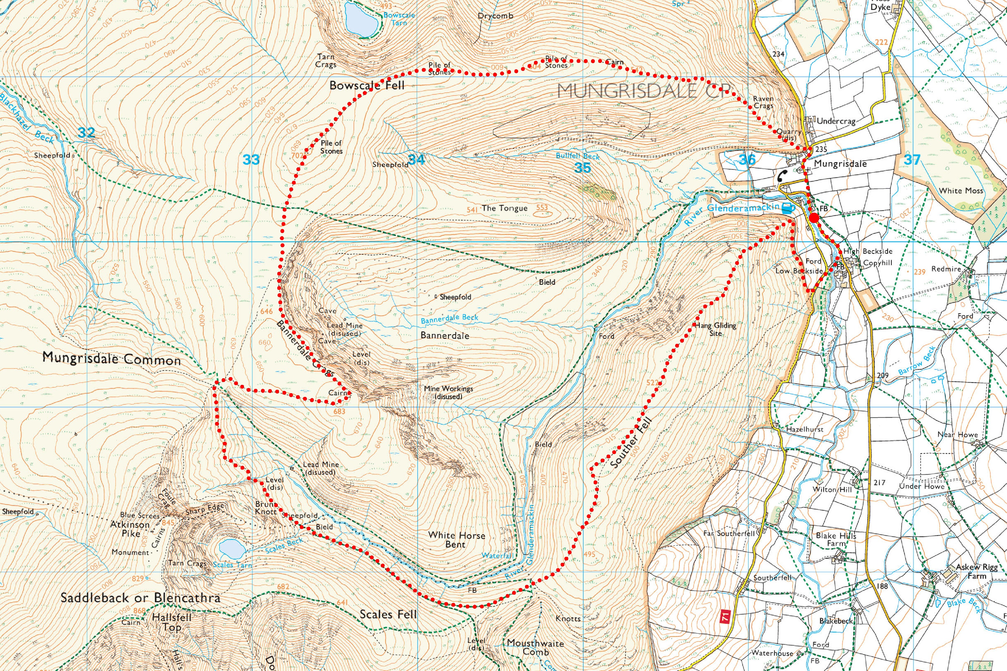Mungrisdale > Raven Crags > East Ridge of Bowscale Fell > Bowscale Fell > Bannerdale Edge > Bannerdale Crags > Glenderamackin Col > Valley of Glenderamackin > Mousthwaite Col > Souther Fell > Beckside > Mungrisdale