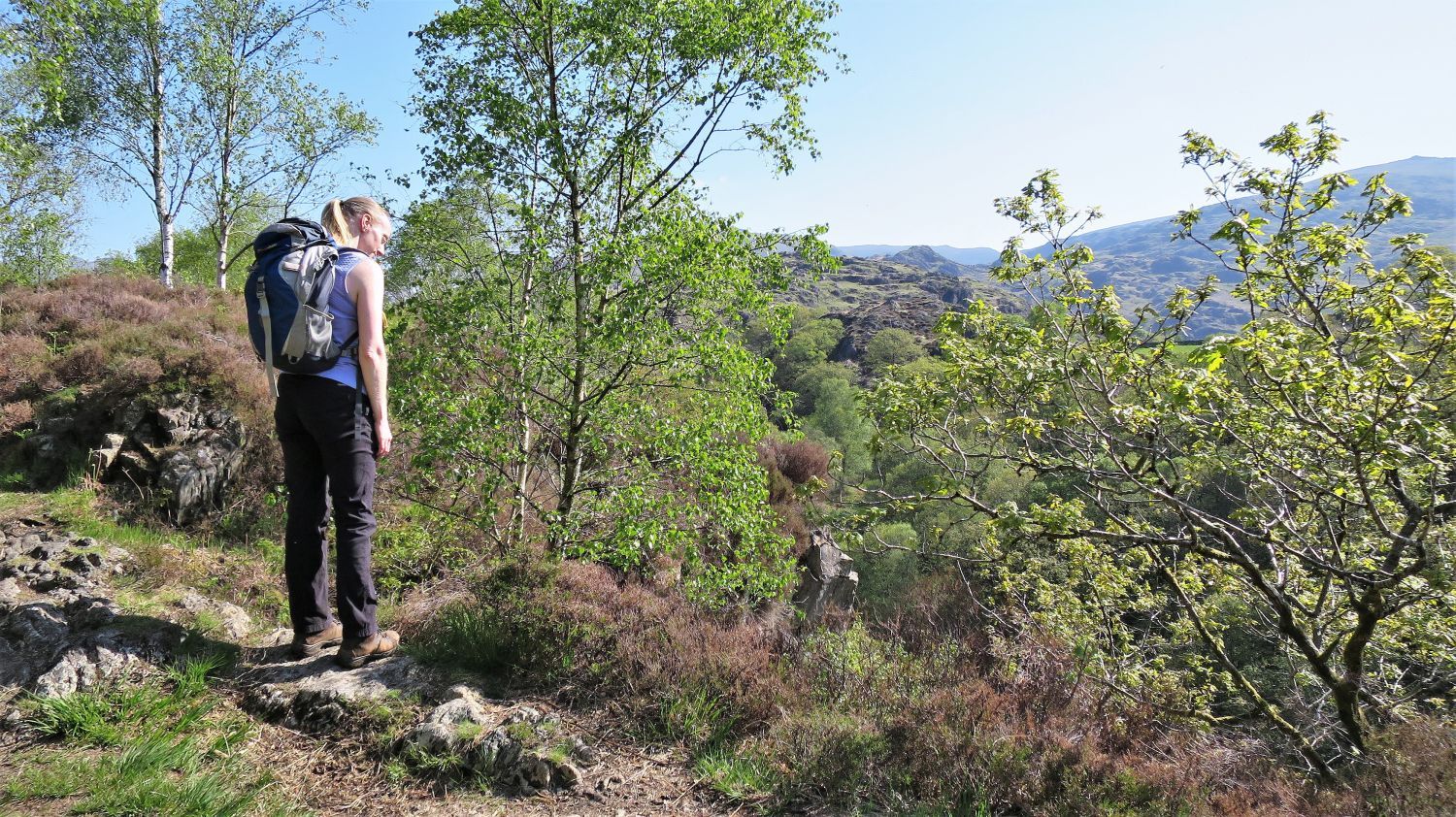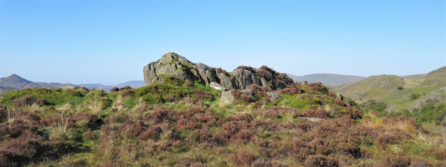 When the lane reaches the north flank of Wallowbarrow Crag, we leave it and follow an indistinct path to climb towards the summit. A natural groove provides an easier ascent over the rock and heather.