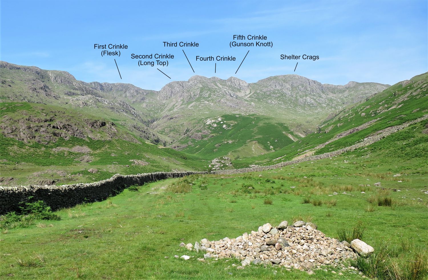 The second Crinkle, Mickle Door, third Crinkle, fifth Crinkle (Gunson Knott), Shelter Crags and Bowfell. The fourth Crinkle is hidden behind the third.