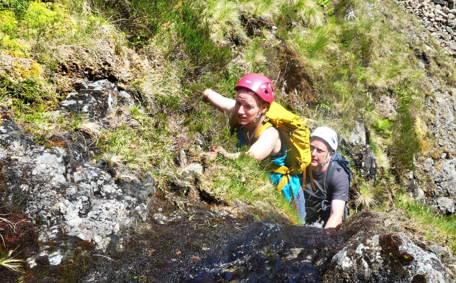 Jaclyn climbing the waterfall at Dour End