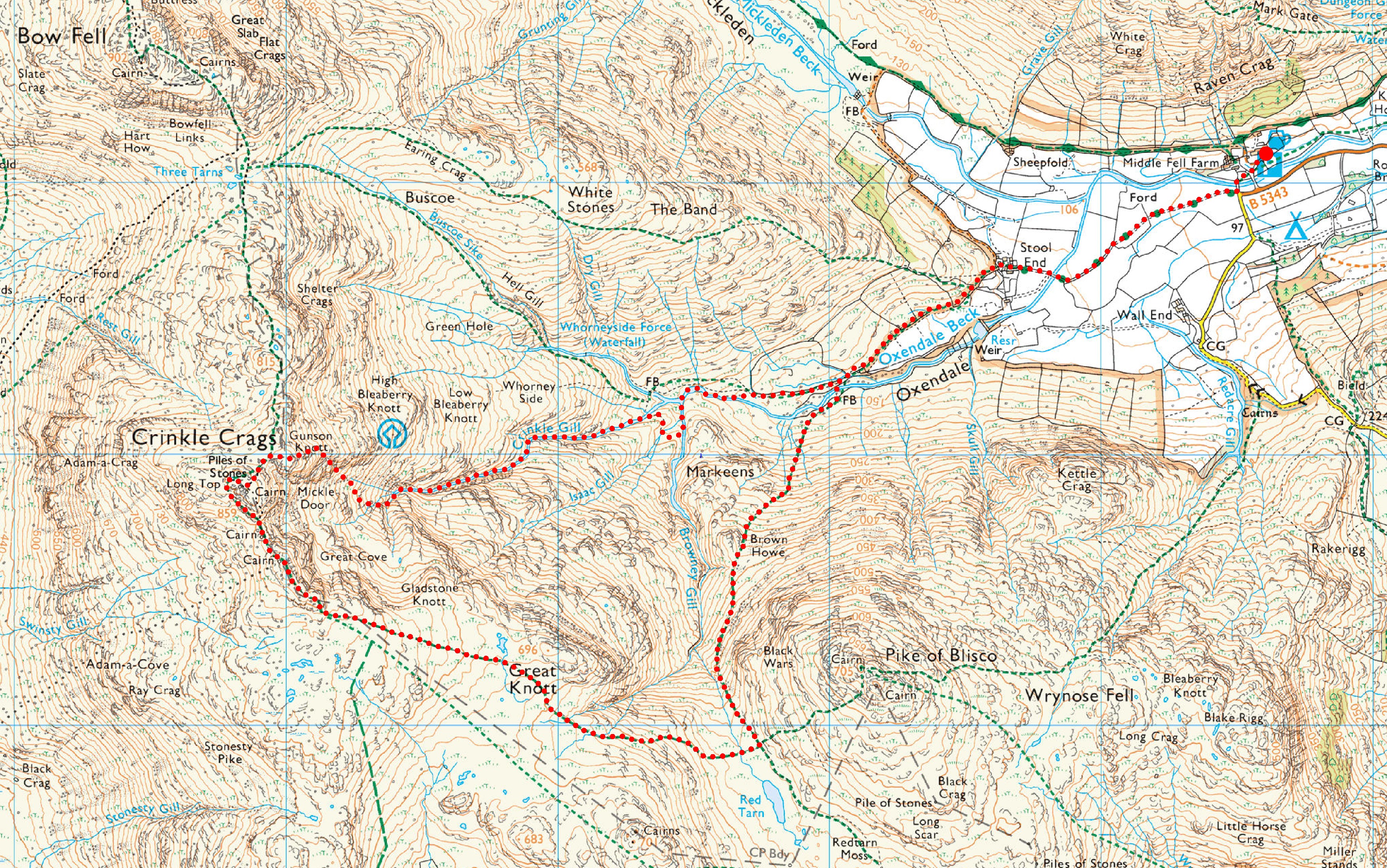 Old Dungeon Ghyll > Stool End > Oxendale > Oxendale Gill > Browney Gill > Crinkle Gill > 3rd Crinkle > 2nd Crinkle > 1st Crinkle > Great Knott > Brown Howe > Oxendale > Stool End > Old Dungeon Ghyll