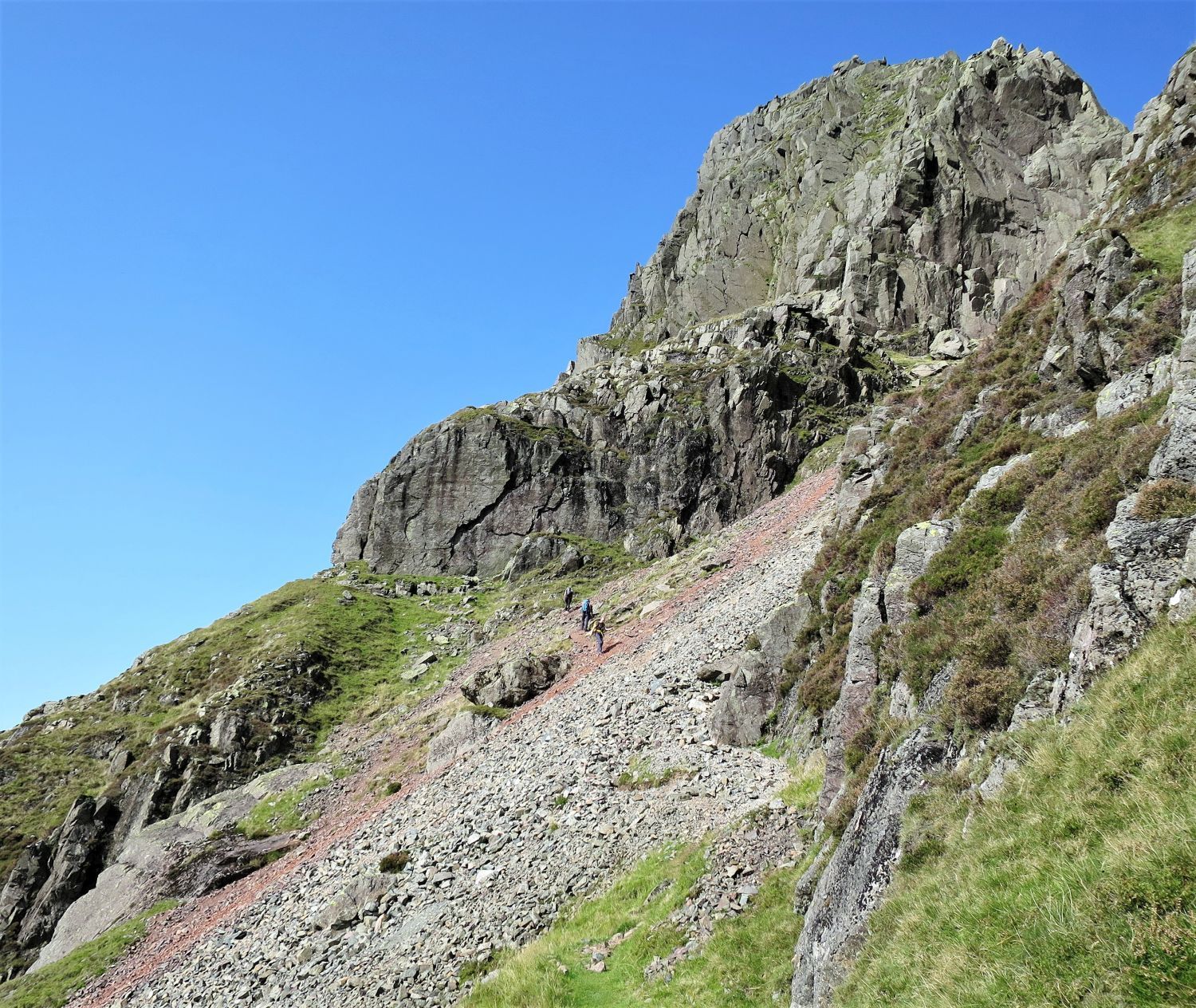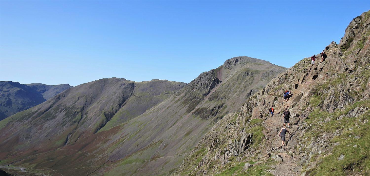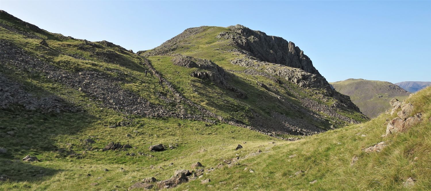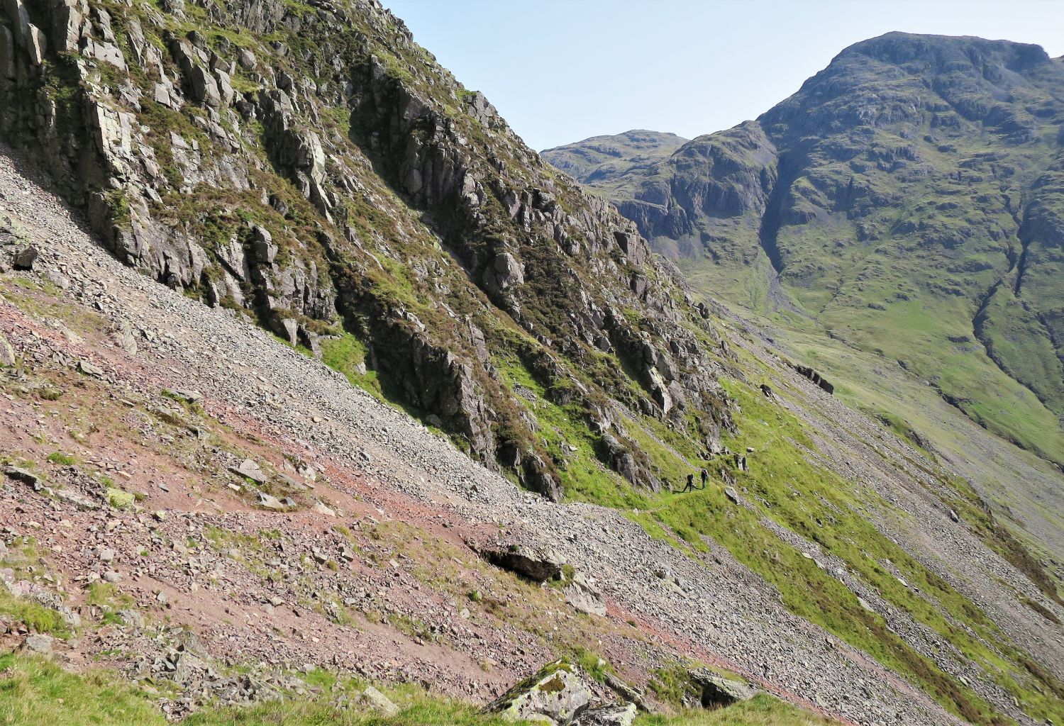 Walkers can be seen approaching the scree of Great Hell Gate, who’ve followed the south traverse from Sty Head.