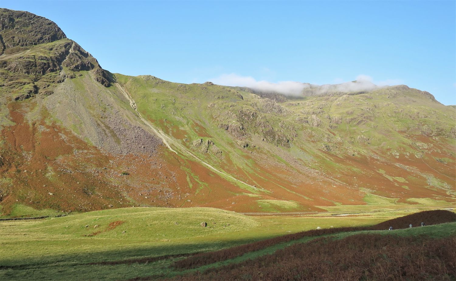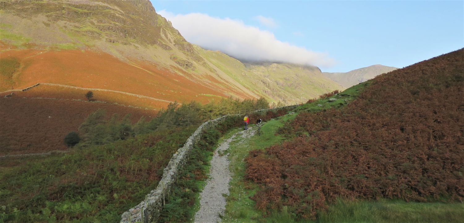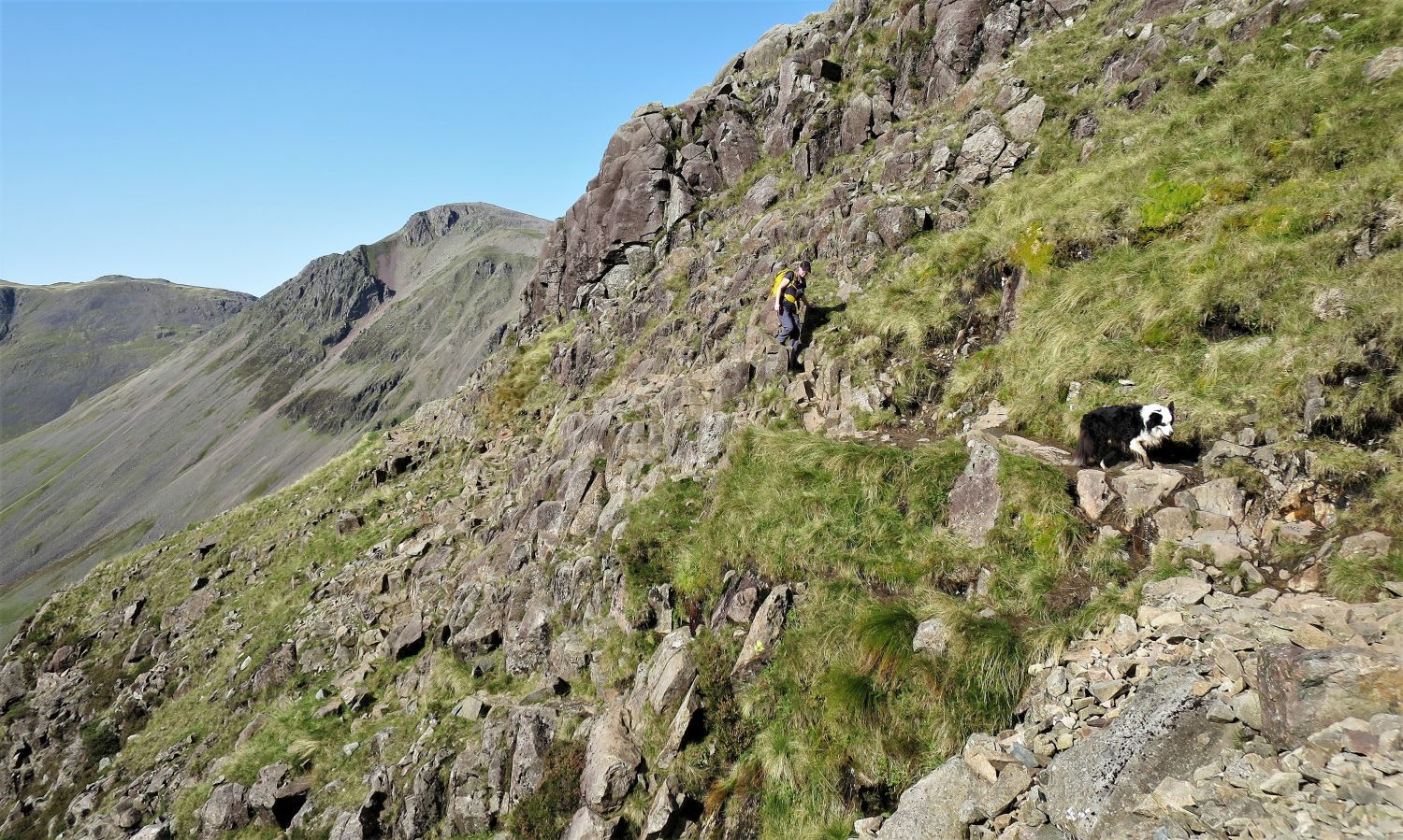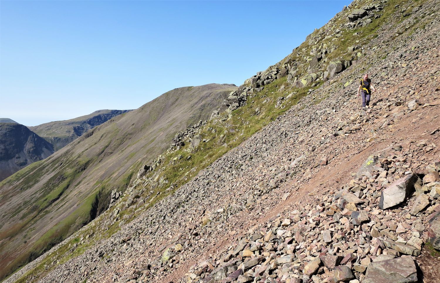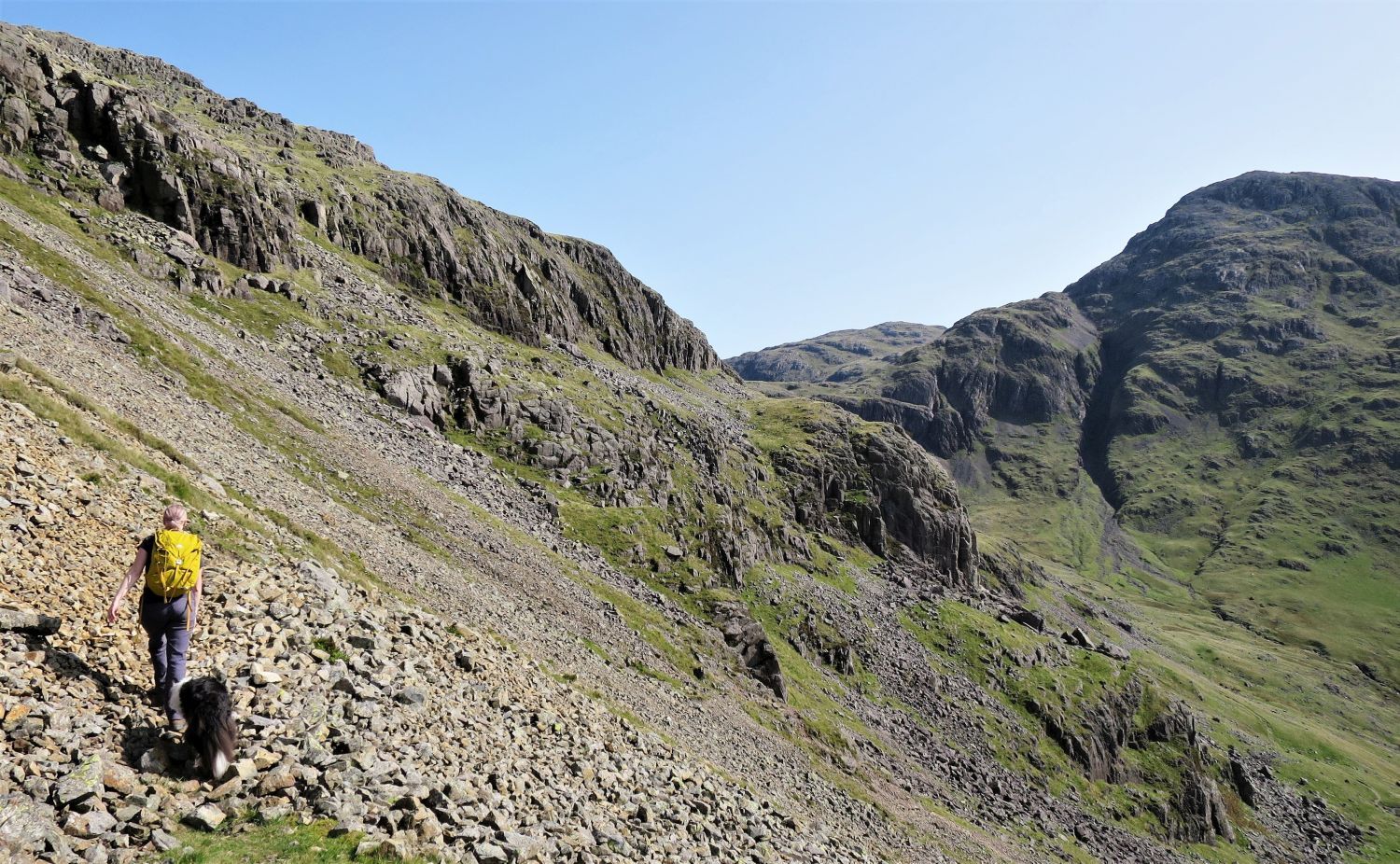 Walkers can be seen approaching the scree of Great Hell Gate, who’ve followed the south traverse from Sty Head.
