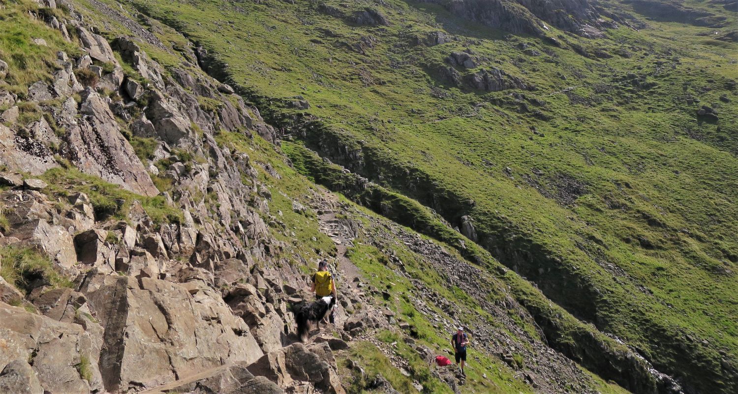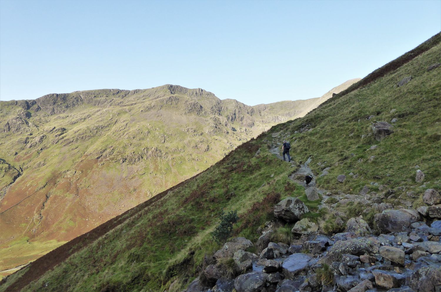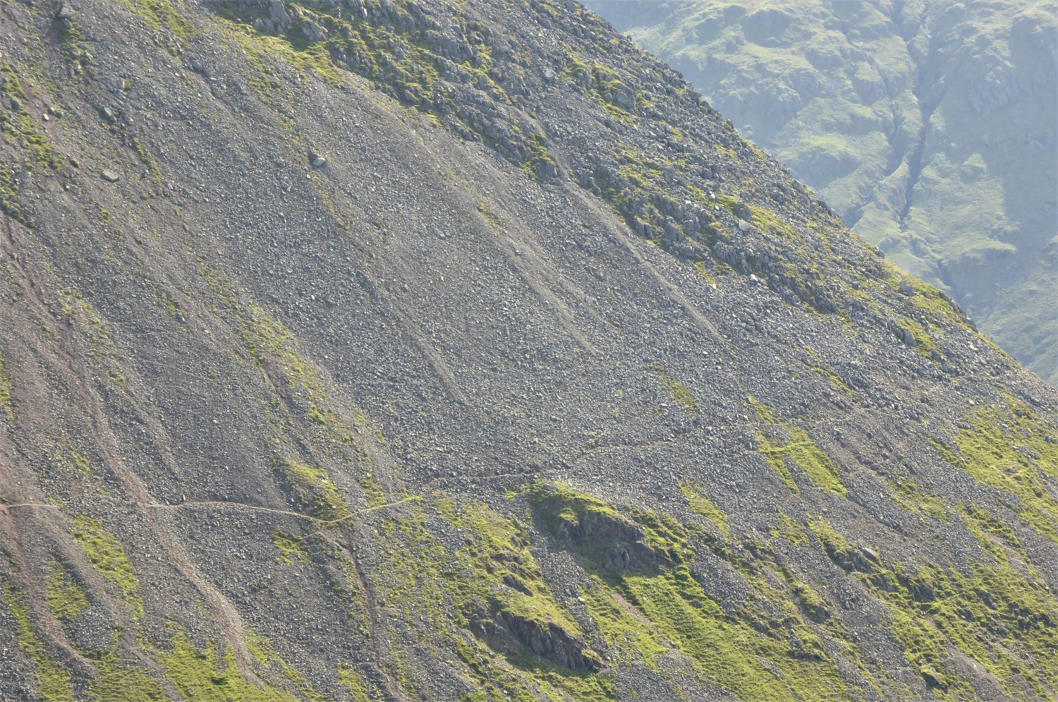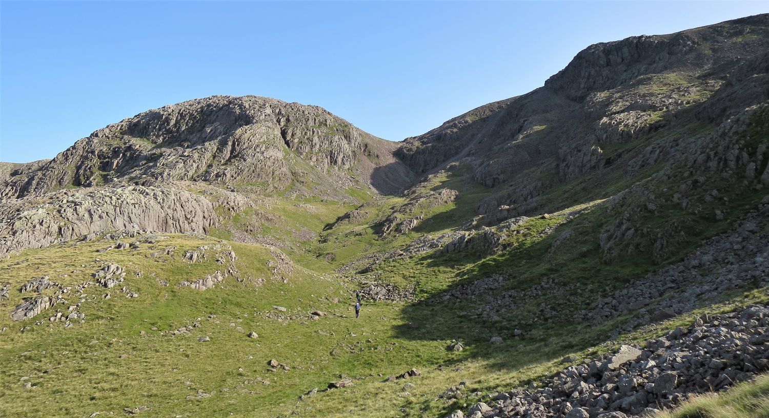 Walkers can be seen approaching the scree of Great Hell Gate, who’ve followed the south traverse from Sty Head.