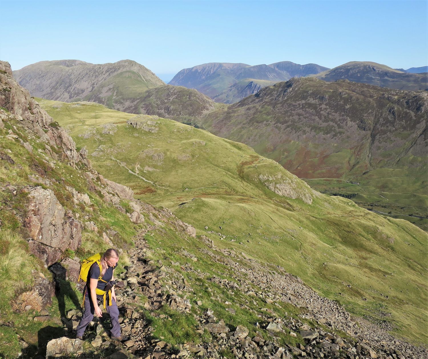 Jaclyn here is turning at a right angle around Gavel Neese (Gable Nose), and starts the long South Traverse. The scenery hereon is some of the finest in Lakeland.