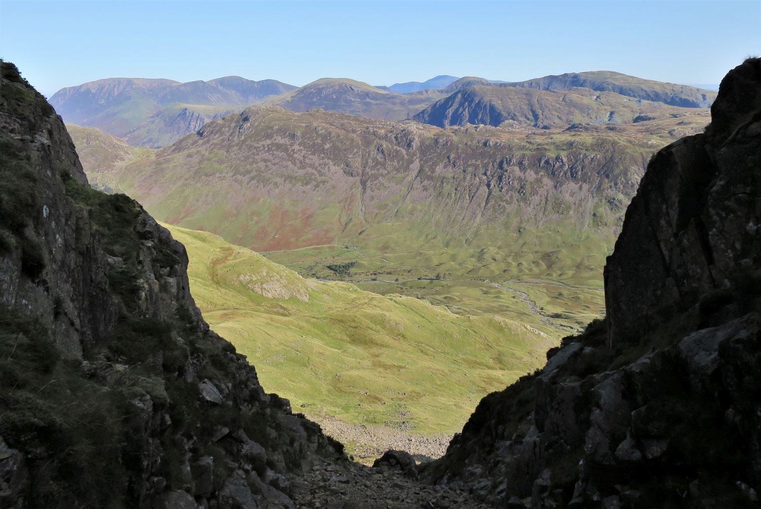 The Ennerdale side of Haystacks dominates the view out of the gully. In the distance, the North Western Fells appear on the left, and far back Skiddaw is seen to the left of Fleetwith Pike and Hindscarth.