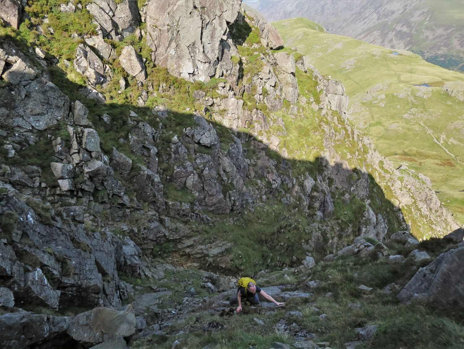 The first section up the groove is complete, and now Jaclyn is on the mid section, a broad slope of rock and grass. The initial gully can be seen behind Jaclyn.
