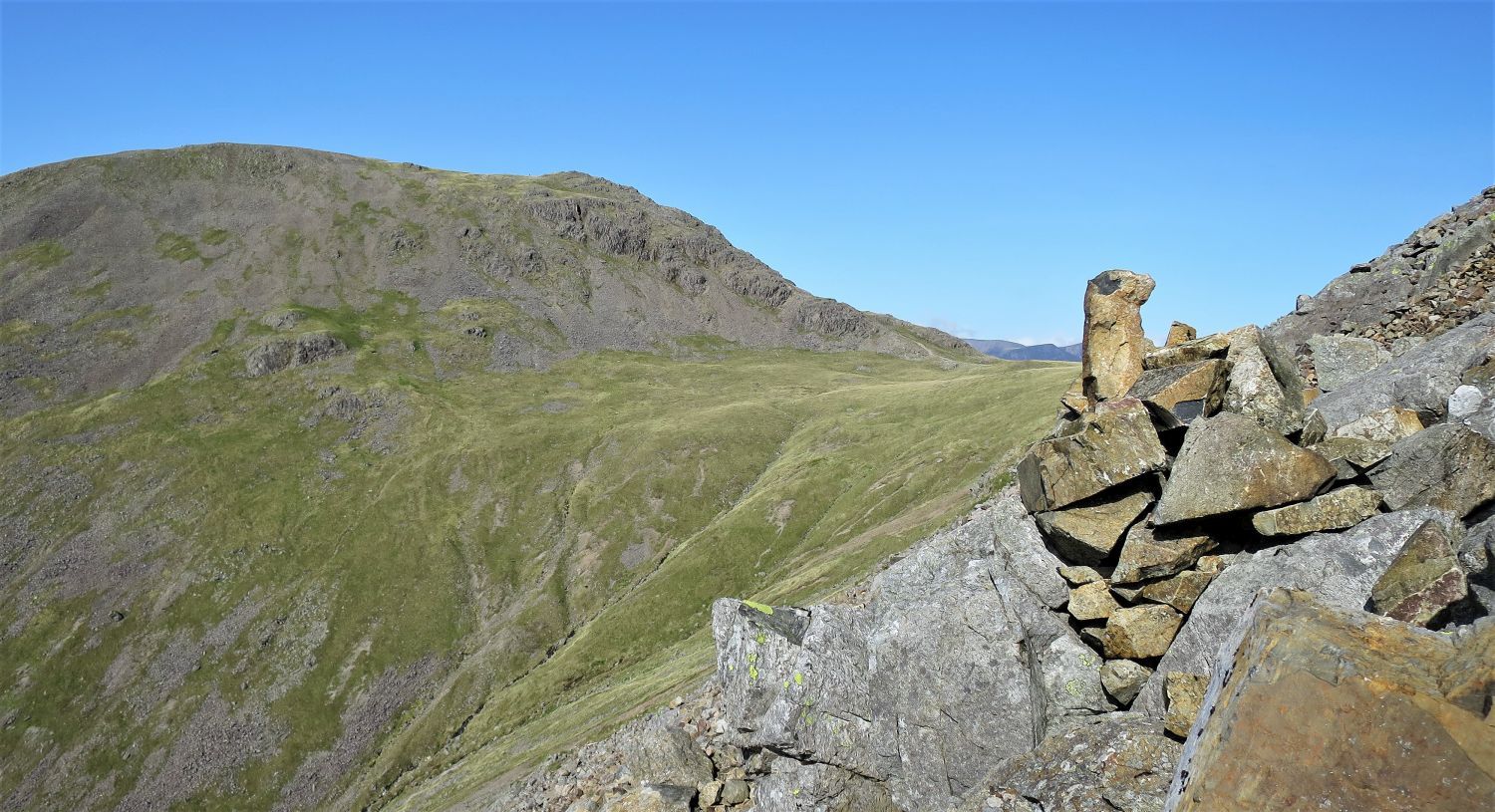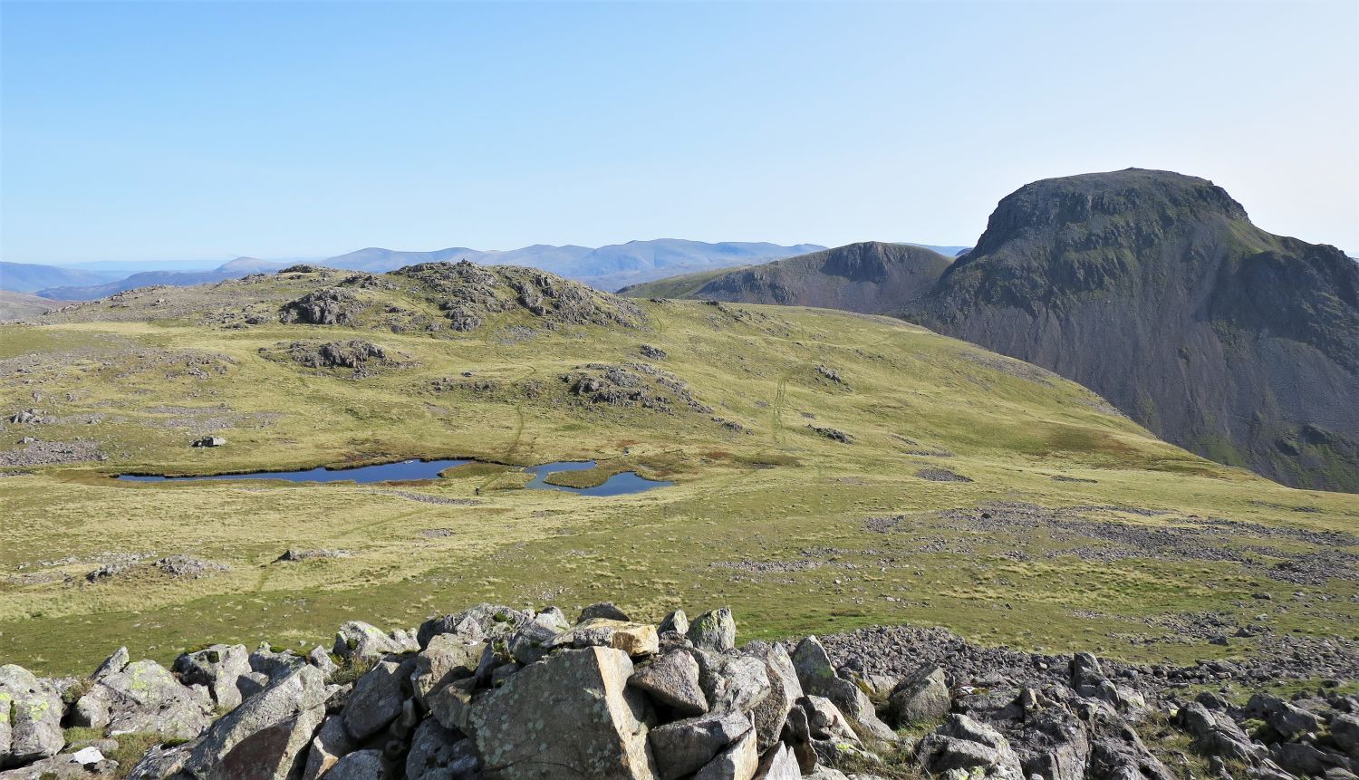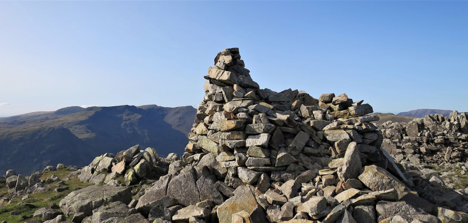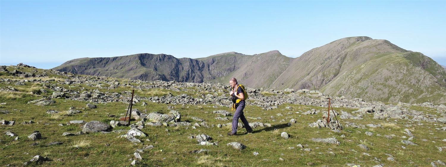 “Eastwards, a high saddle connects the fell with Scafell Pike, but on other sides steep slopes descend abruptly from the wide top.” Lingmell 2