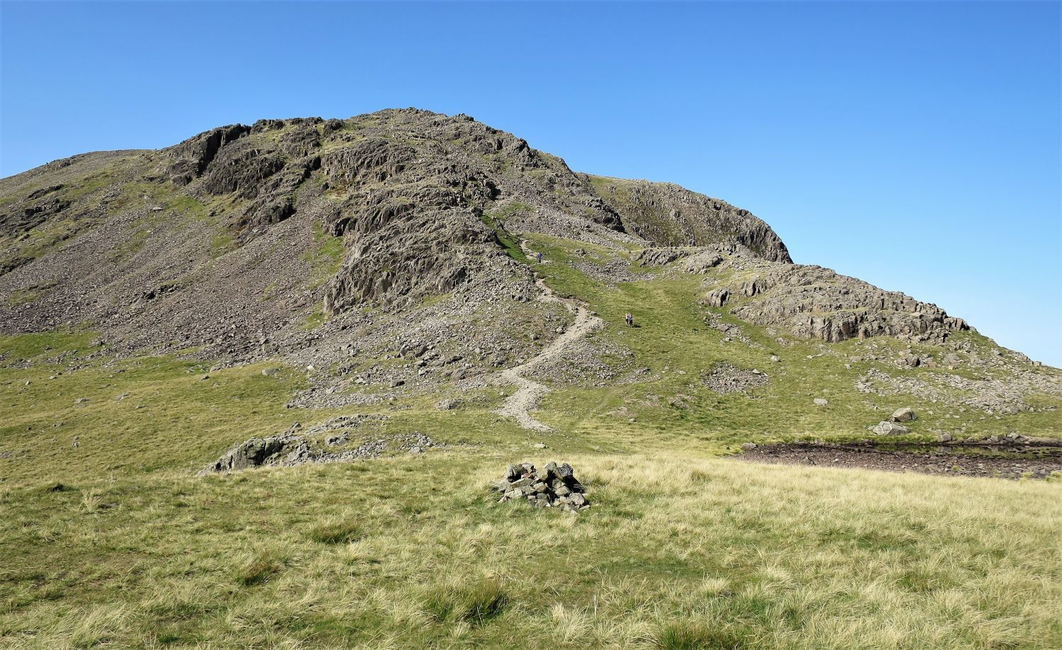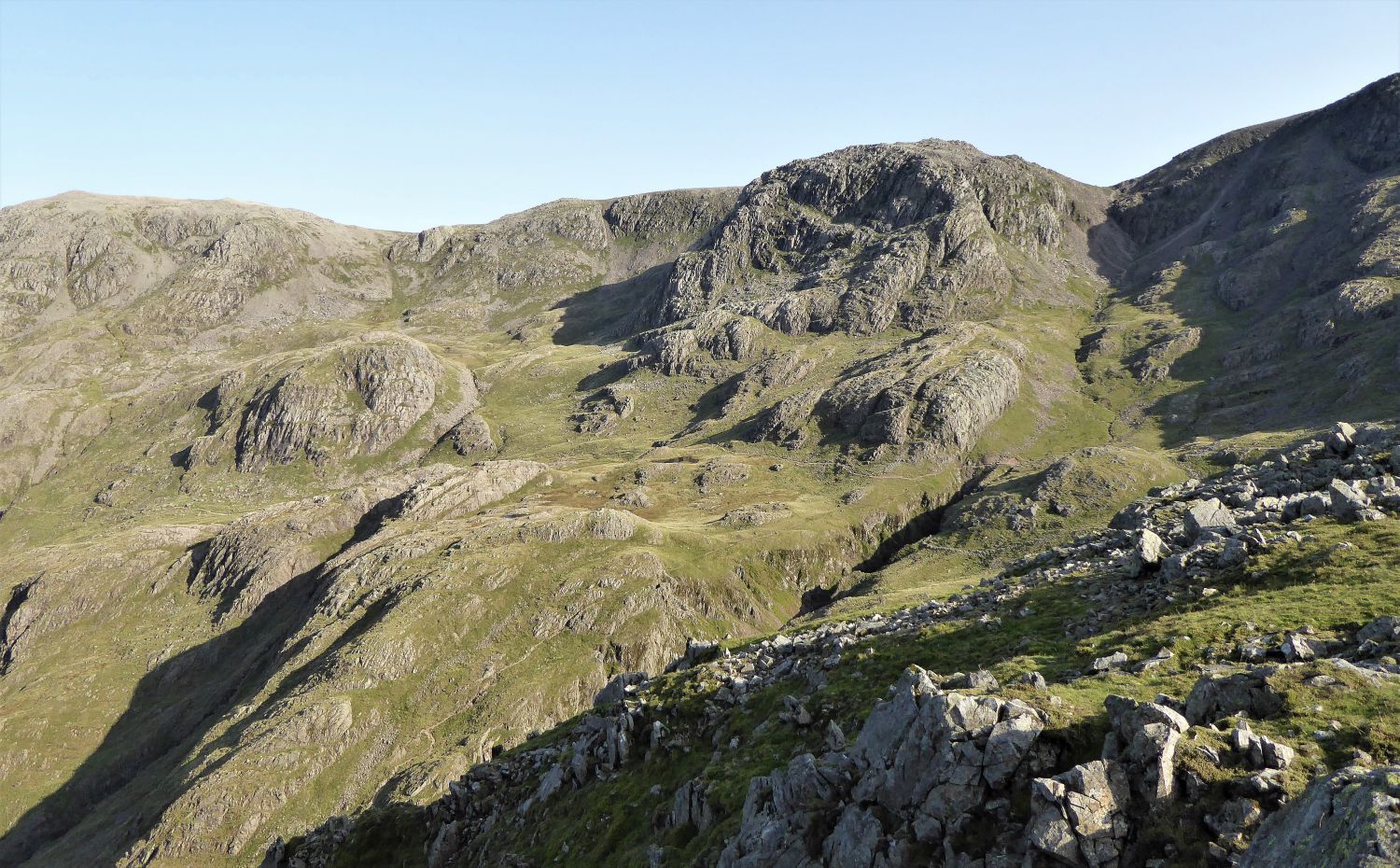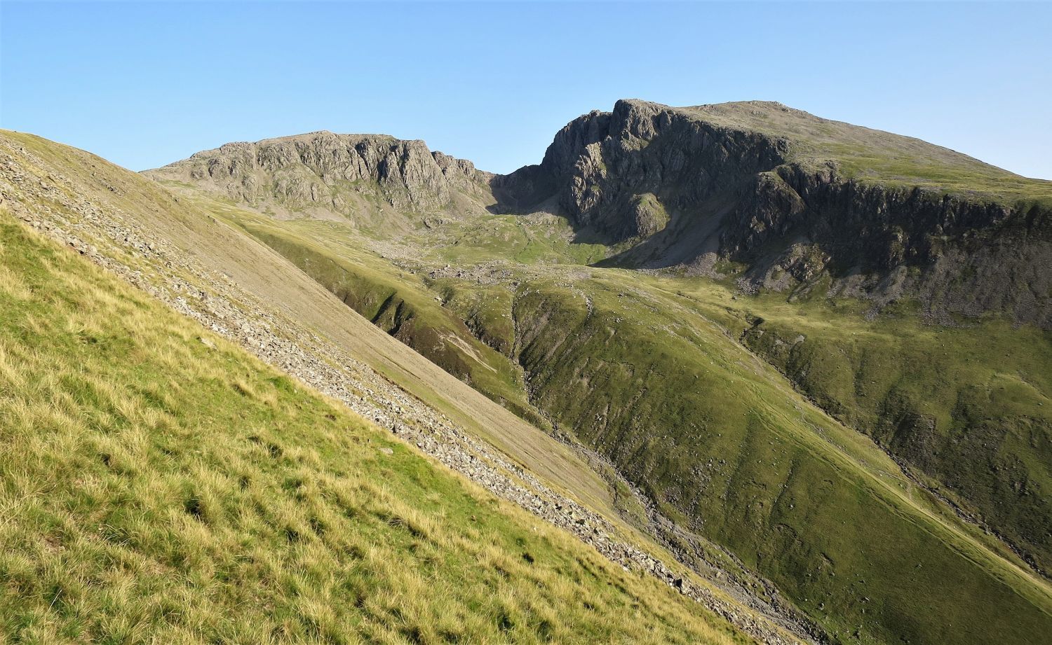 “Eastwards, a high saddle connects the fell with Scafell Pike, but on other sides steep slopes descend abruptly from the wide top.” Lingmell 2