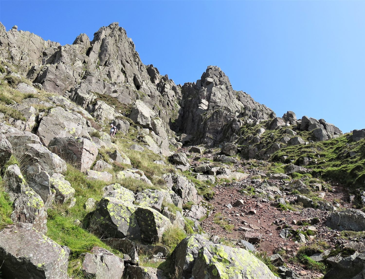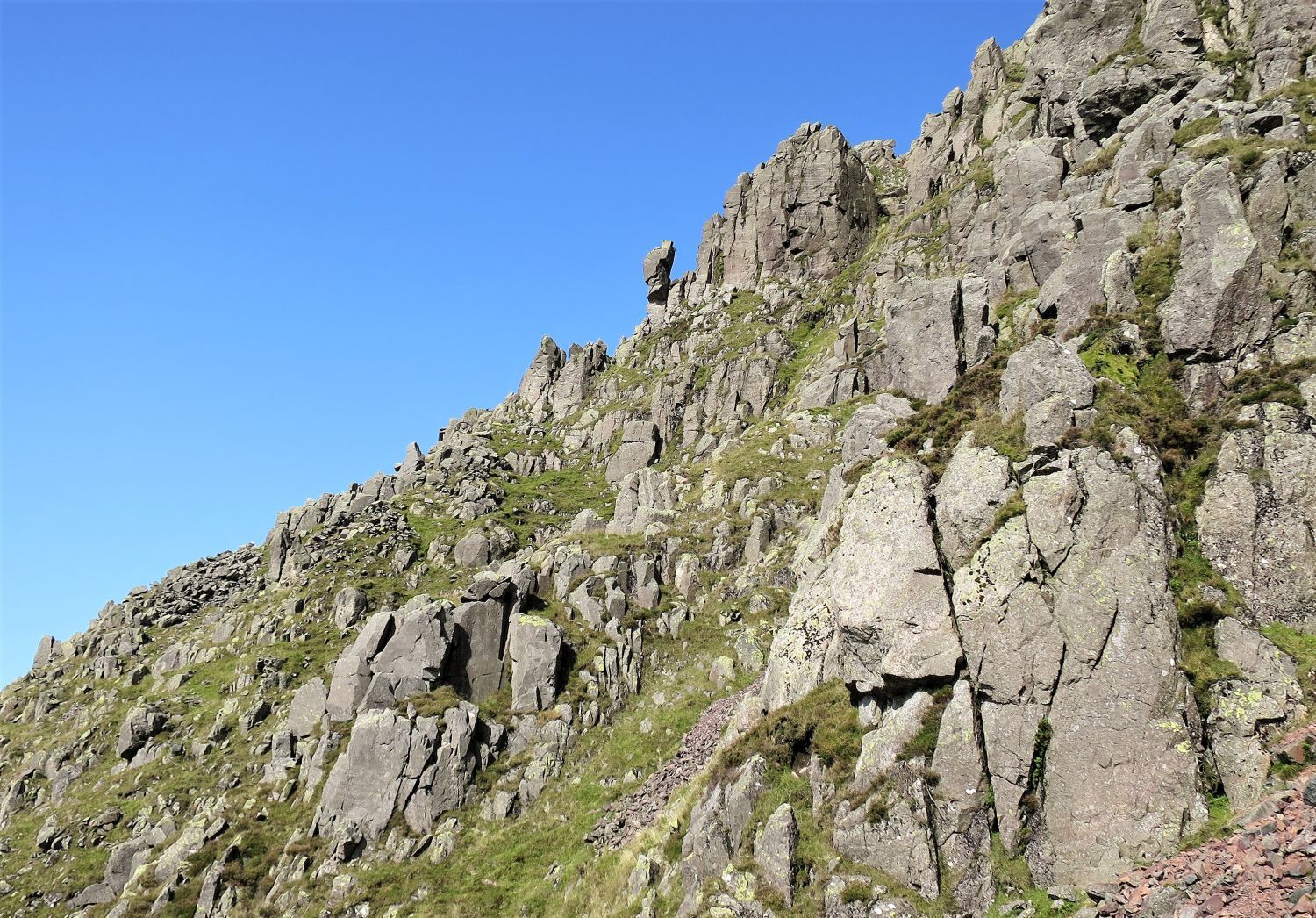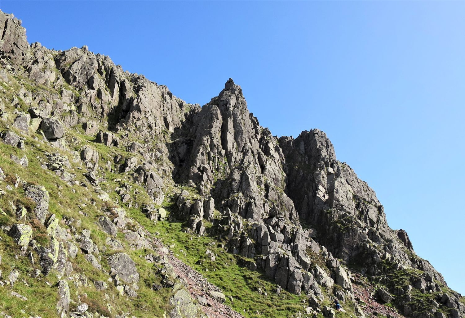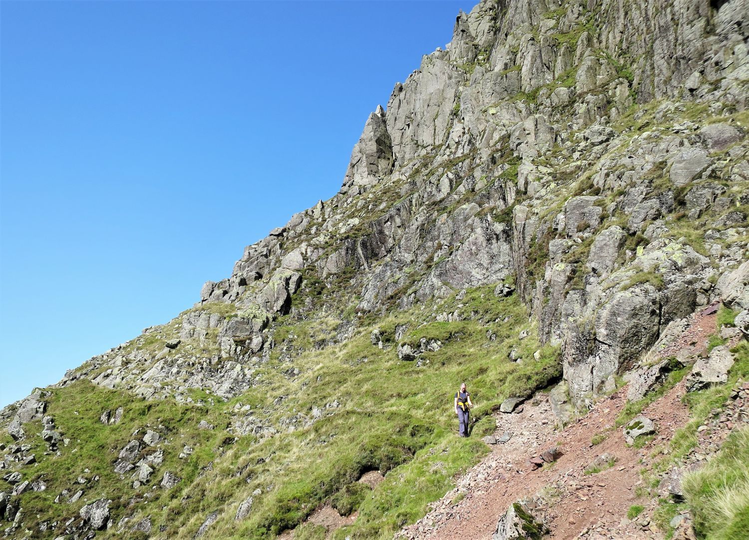 Napes Needle is difficult to spot against the complex rock structures of Great Napes; it is on the right, below the aptly named Needle Ridge. We are now on the lower path of the South Traverse; a walker can be seen on the upper South Traverse below Eagle’s Nest Ridge. The paths meet again below Napes Needle.