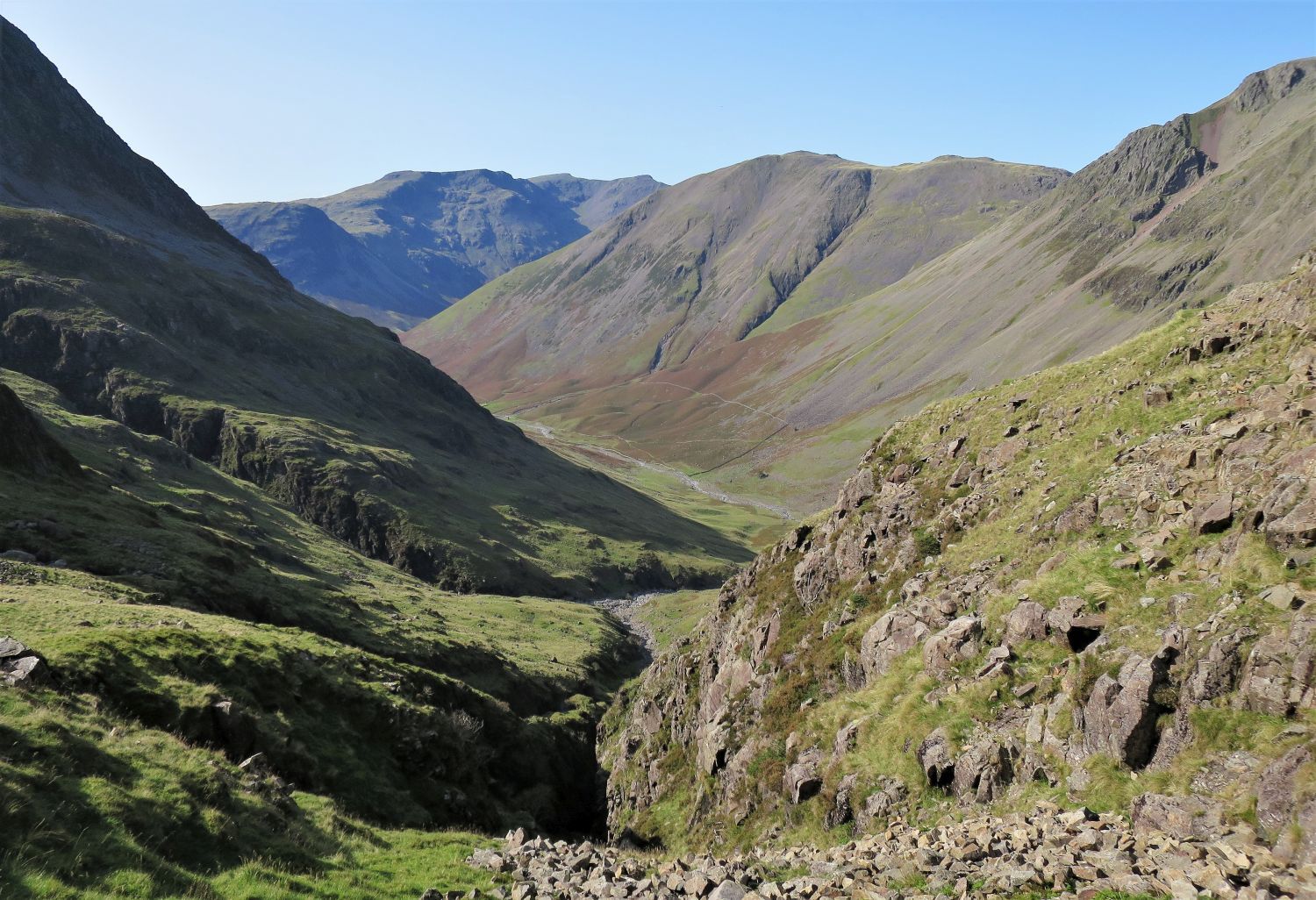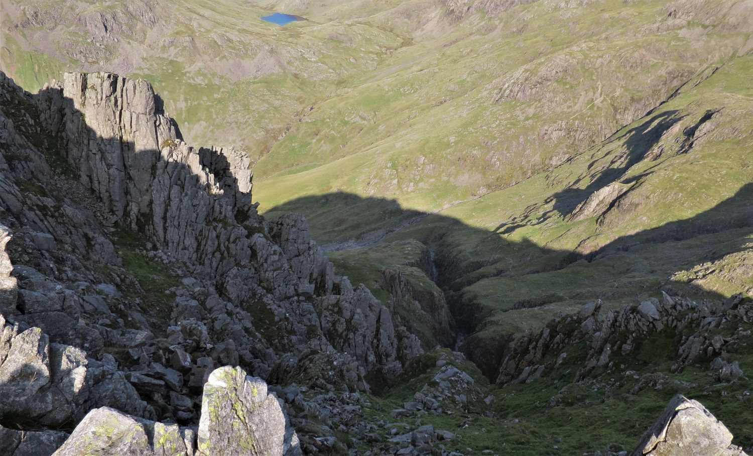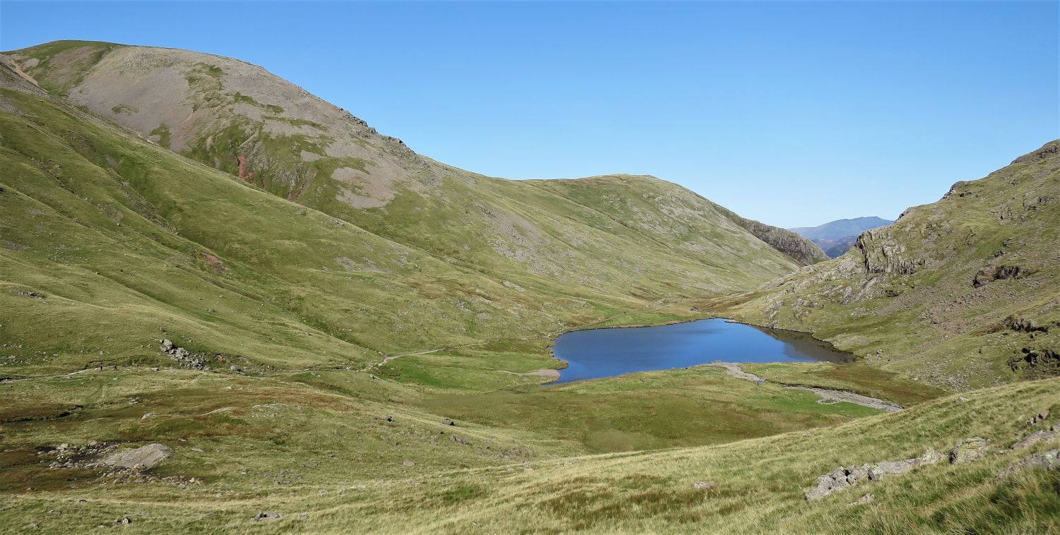 Looking down to Piers Gill, with Styhead Tarn above.