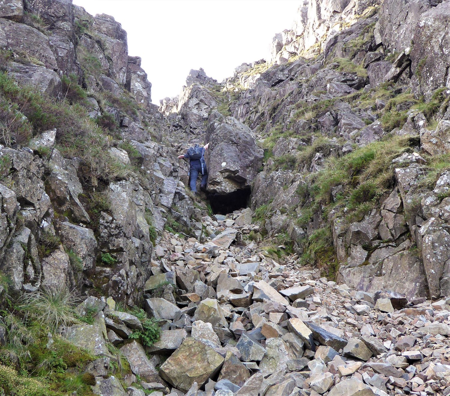 Once in the gully, a very large boulder can be seen blocking the way, however, there are two options to climb around it: to the left of the boulder, a steep narrow gap requires long legs and good knees, while on the right a series of rocky grass ledges provide a slightly easier route to negotiate the obstacle. The scree in the gully, above and below the chockstone, is steep and very unstable, so care is needed.