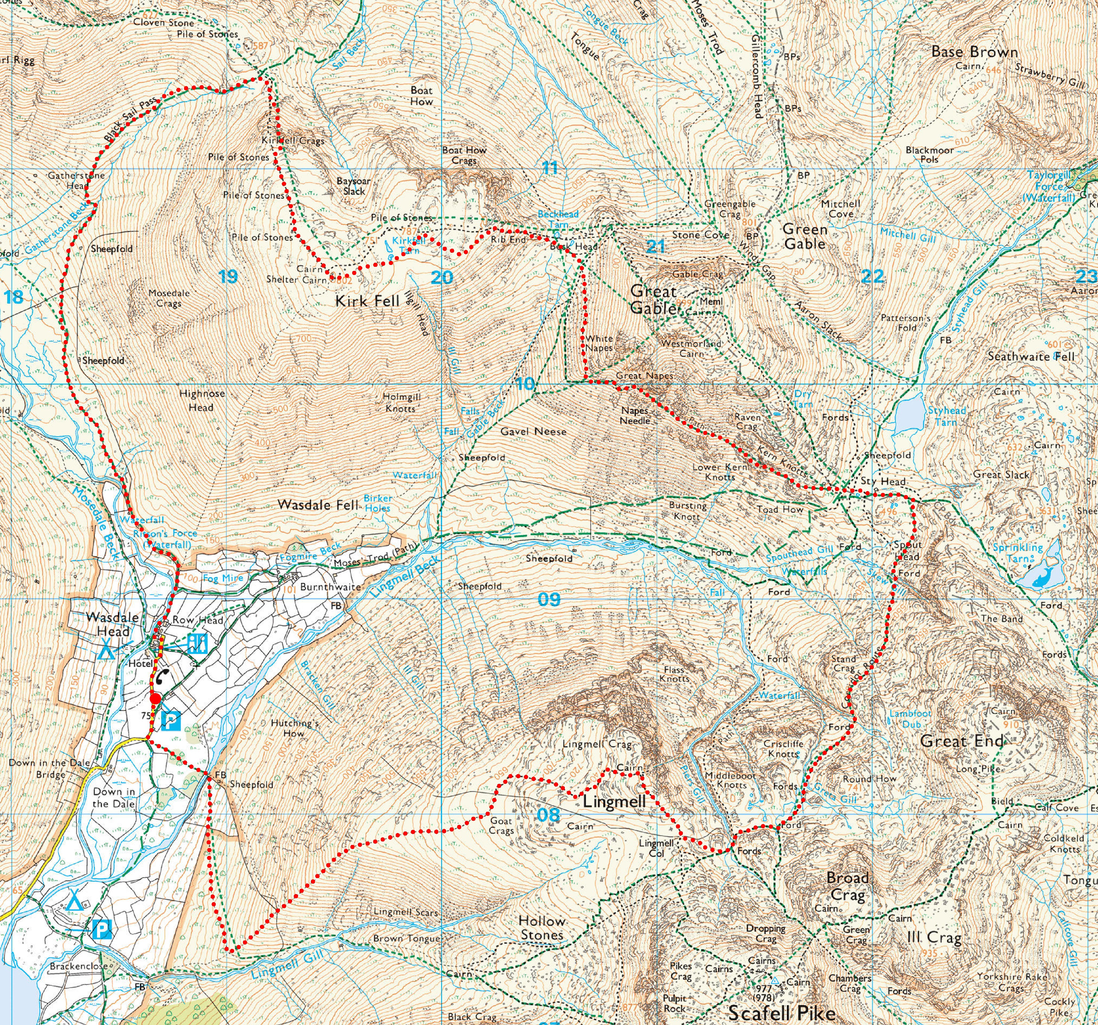 Wasdale Head > Mosedale > Gatherstone Head > Black Sail Pass > Kirkfell Crags > Kirk Fell > Rib End > Beck Head > Gable Girdle > Sty Head > Corridor Route > Lingmell > Wasdale Head
